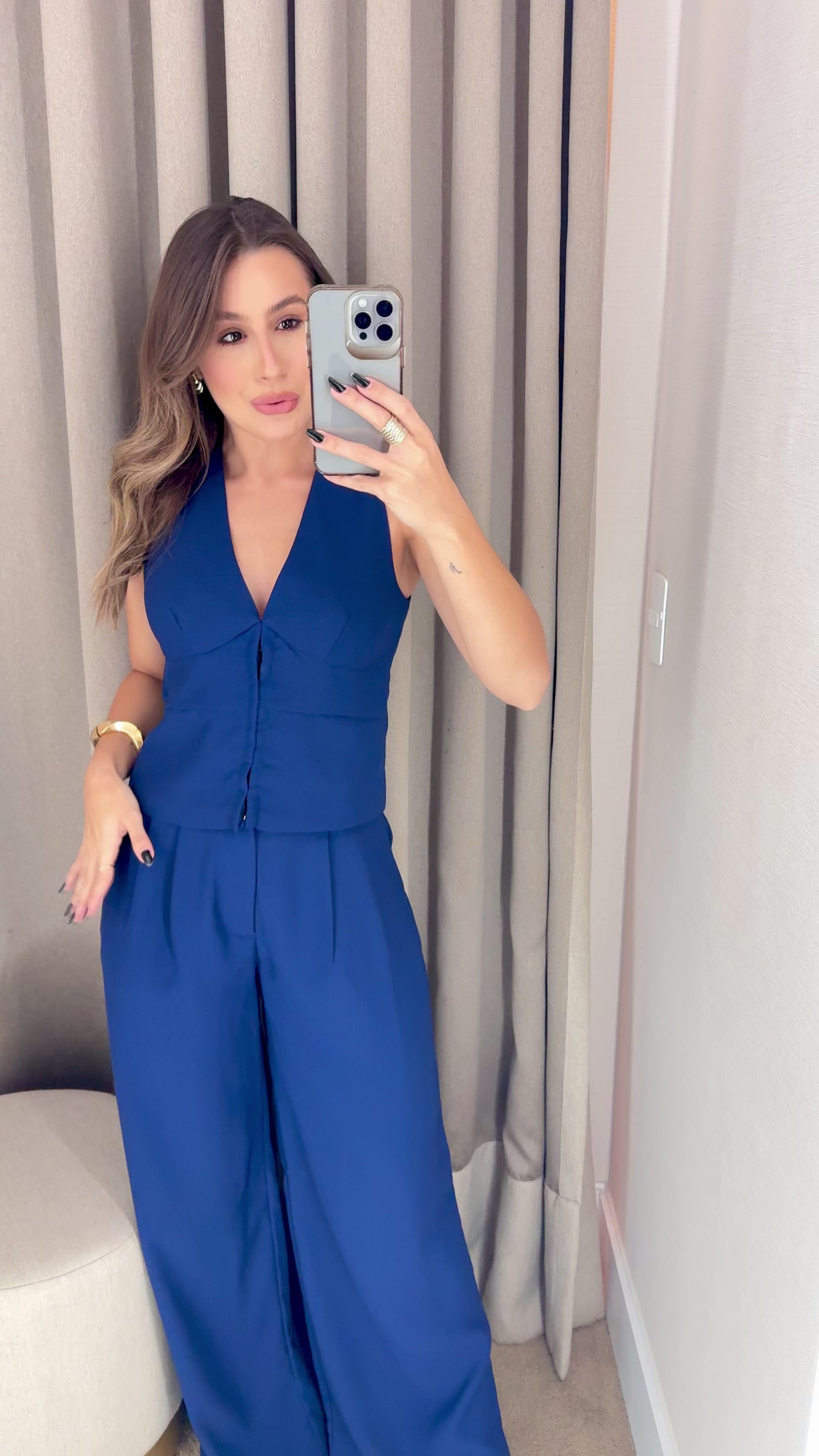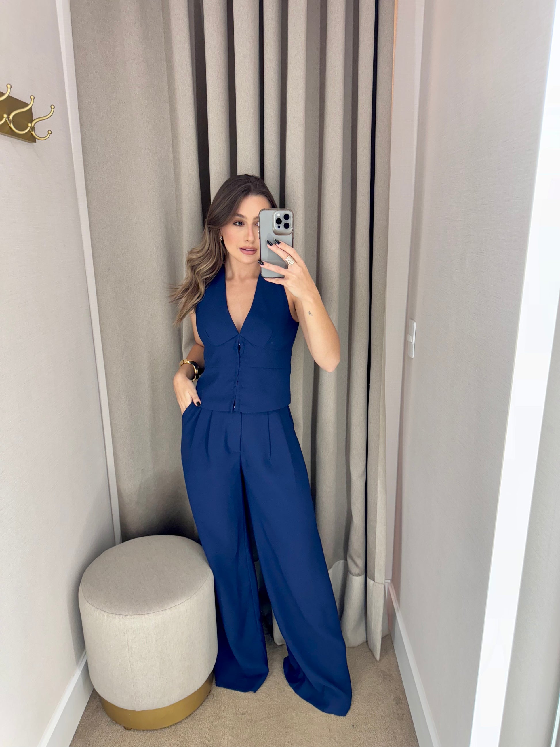 Colete azul marinho em alfaiataria, com modelagem ajustada e sofisticada, a peça possui decote em V e fechamento frontal, valorizando o busto.