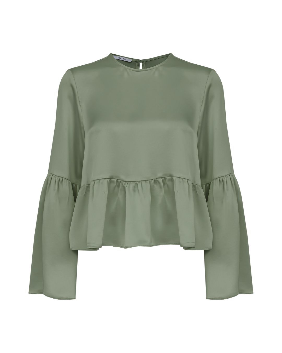 Blusa em tecido acetinado verde oliva, com caimento leve e toque sofisticado. O modelo possui mangas longas com babado na barra e recorte peplum na cintura, que adiciona charme e movimento à peça. Com gola redonda e fechamento por botão nas costas, é perfeita para produções elegantes e modernas,