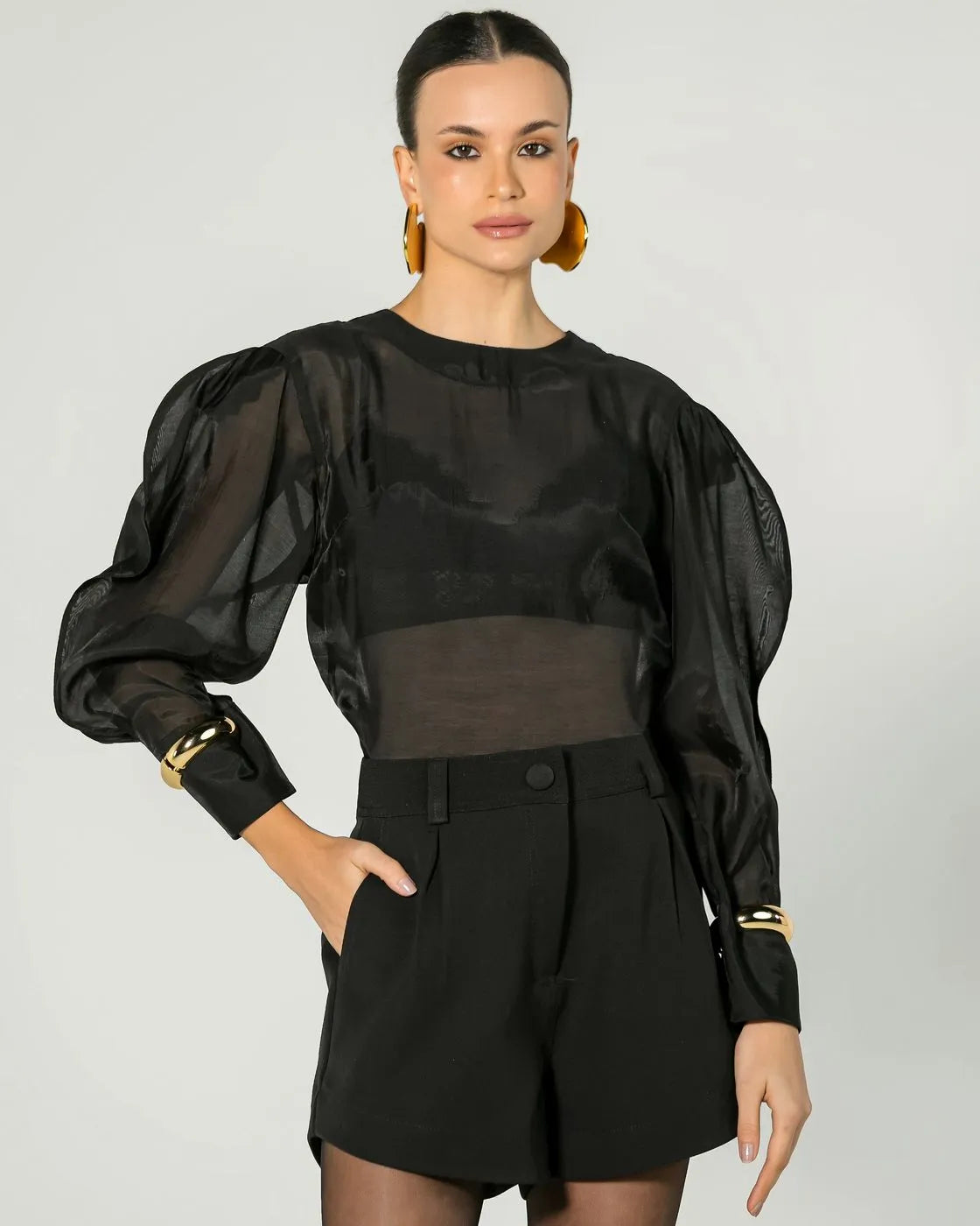 Blusa sofisticada em tecido com leve transparência e mangas bufantes marcantes que trazem volume e elegância ao look. Modelagem reta com punhos estruturados e detalhe de abotoamento. A combinação perfeita de estilo e atitude.