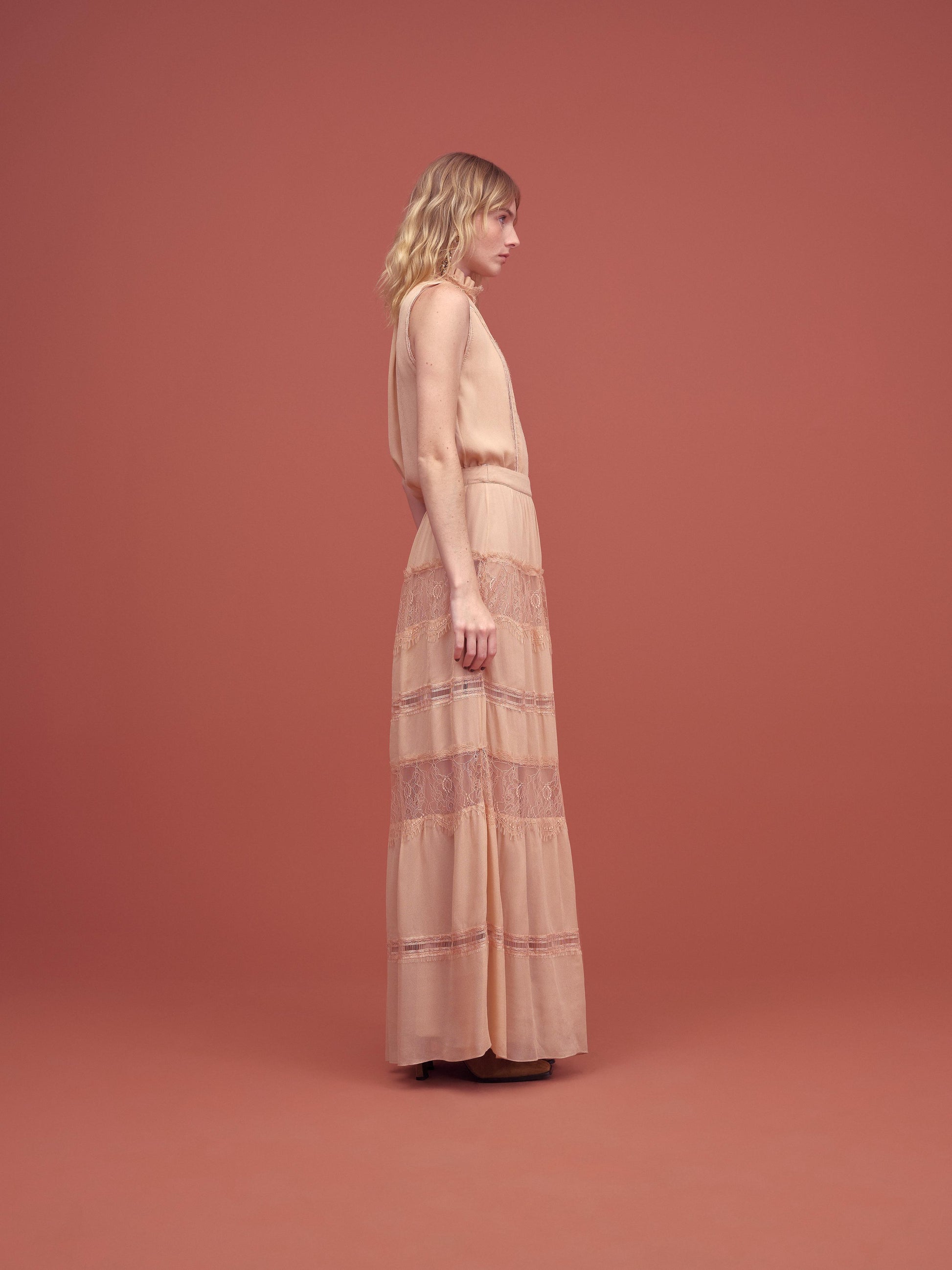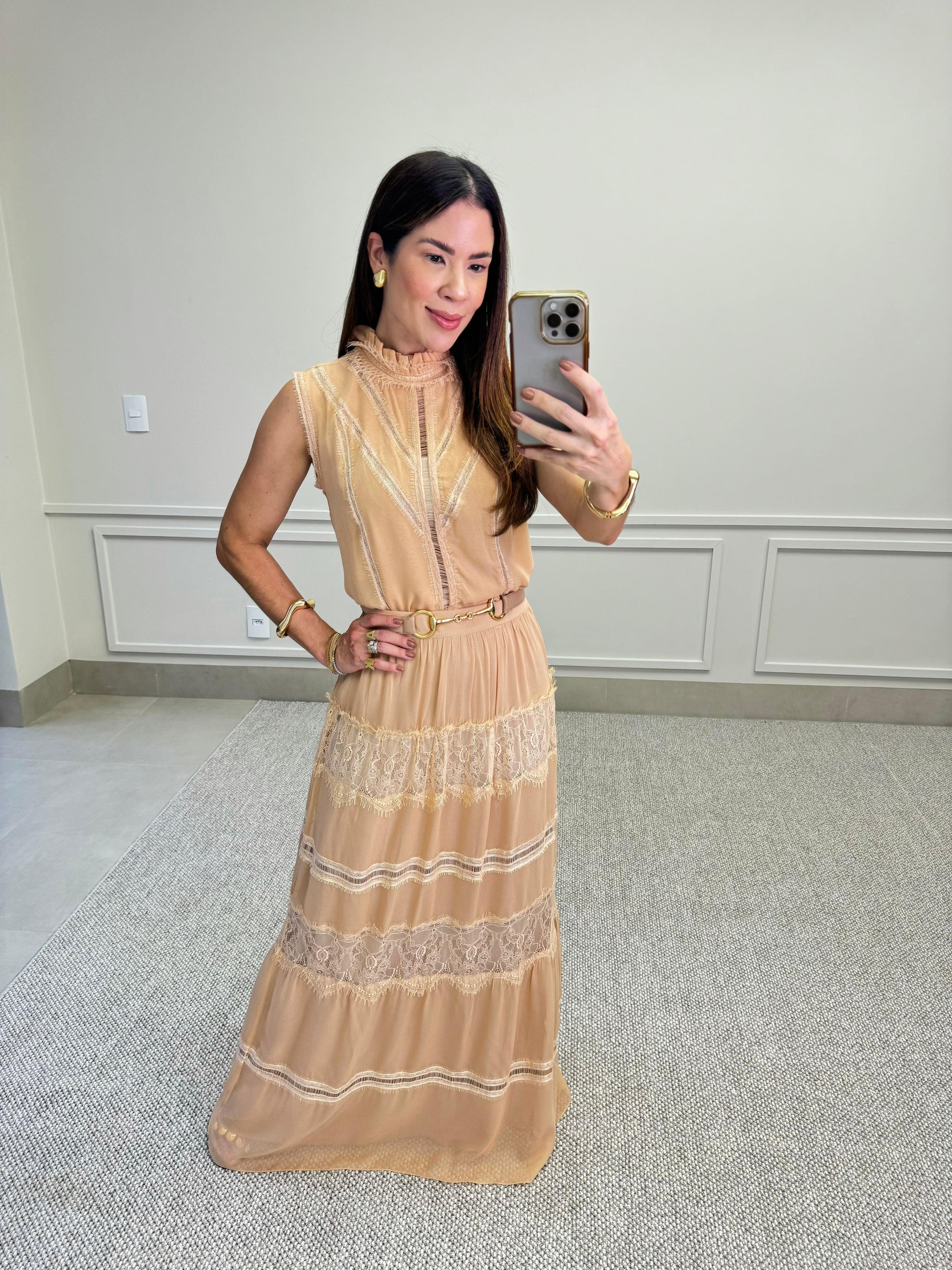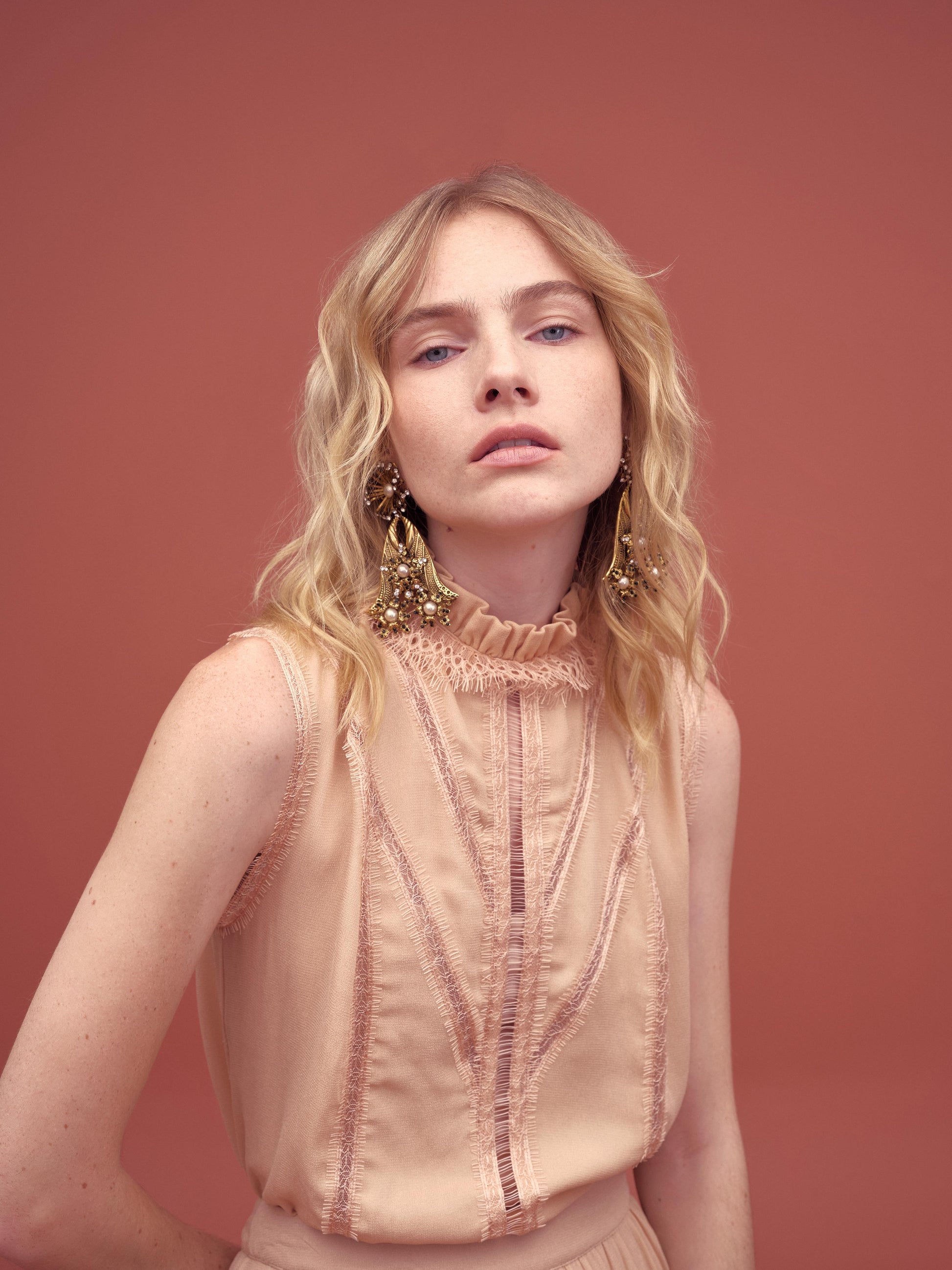 Blusa sem mangas em tom nude, com delicado acabamento em renda e babados no decote. Possui detalhes frontais que trazem sofisticação à peça. O tecido leve e fluido garante conforto, enquanto o design romântico adiciona elegância ao look. Ideal para compor produções femininas e refinadas.
