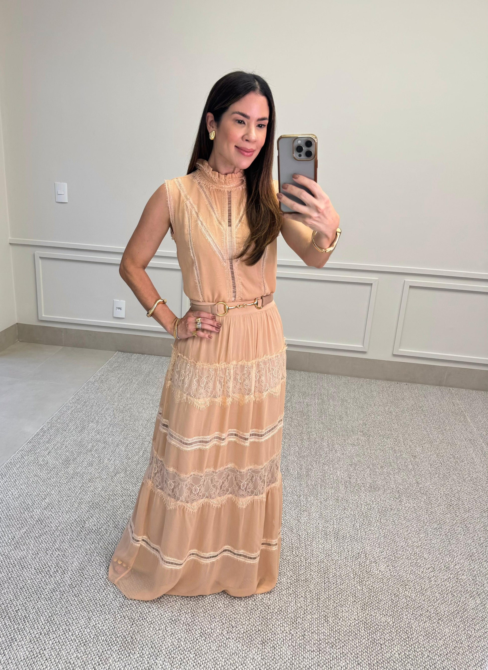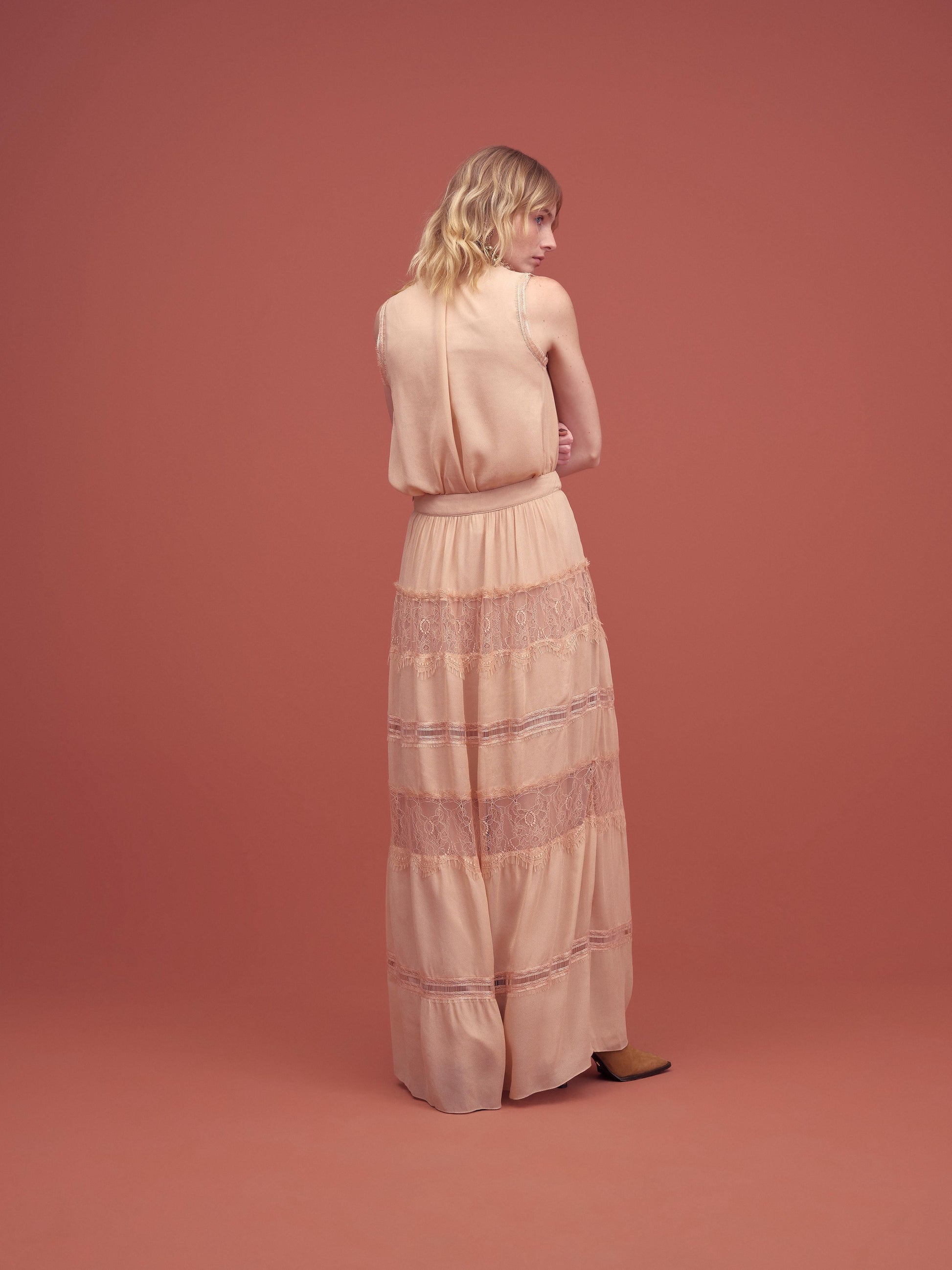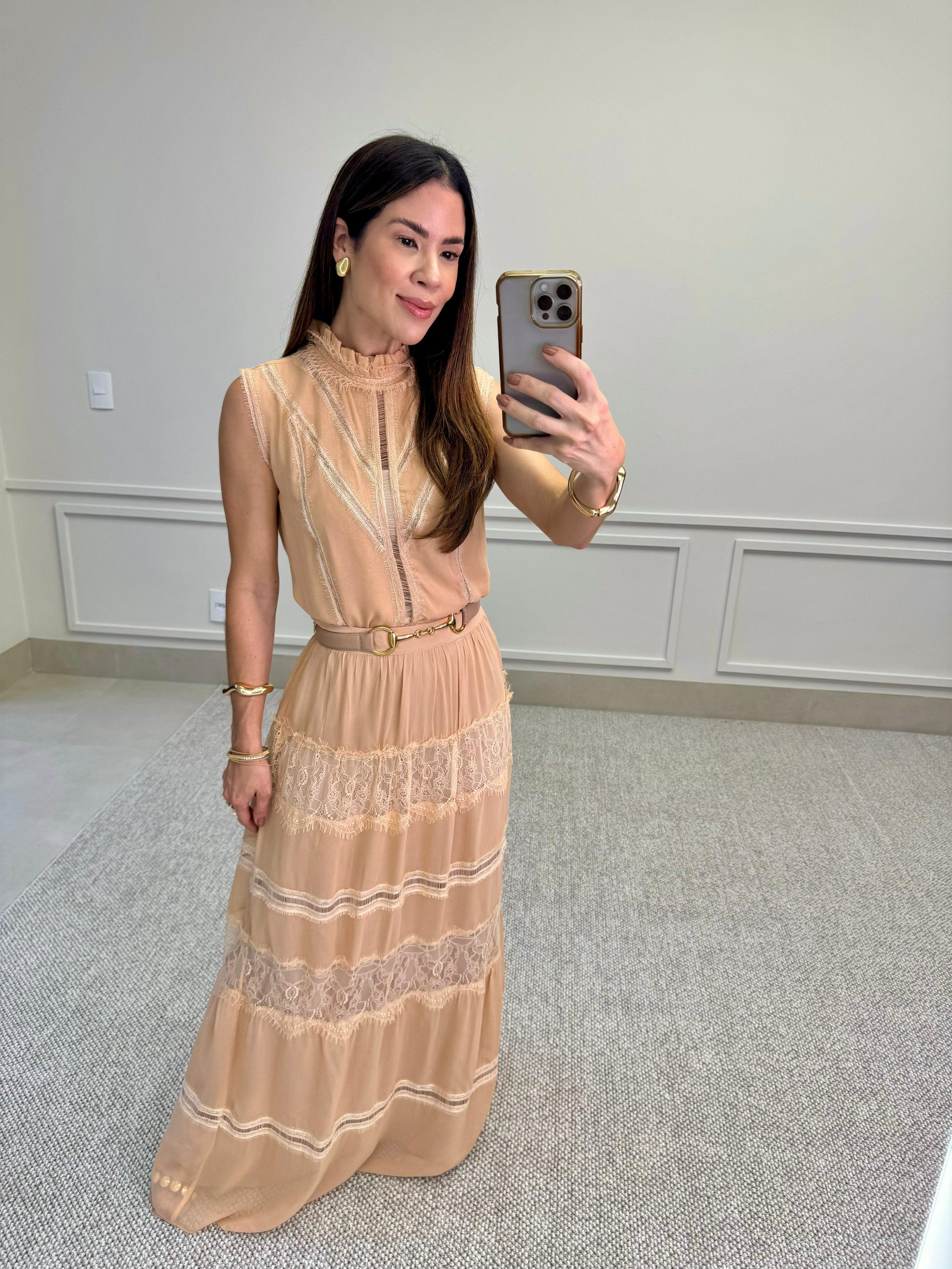 Blusa sem mangas em tom nude, com delicado acabamento em renda e babados no decote. Possui detalhes frontais que trazem sofisticação à peça. O tecido leve e fluido garante conforto, enquanto o design romântico adiciona elegância ao look. Ideal para compor produções femininas e refinadas.