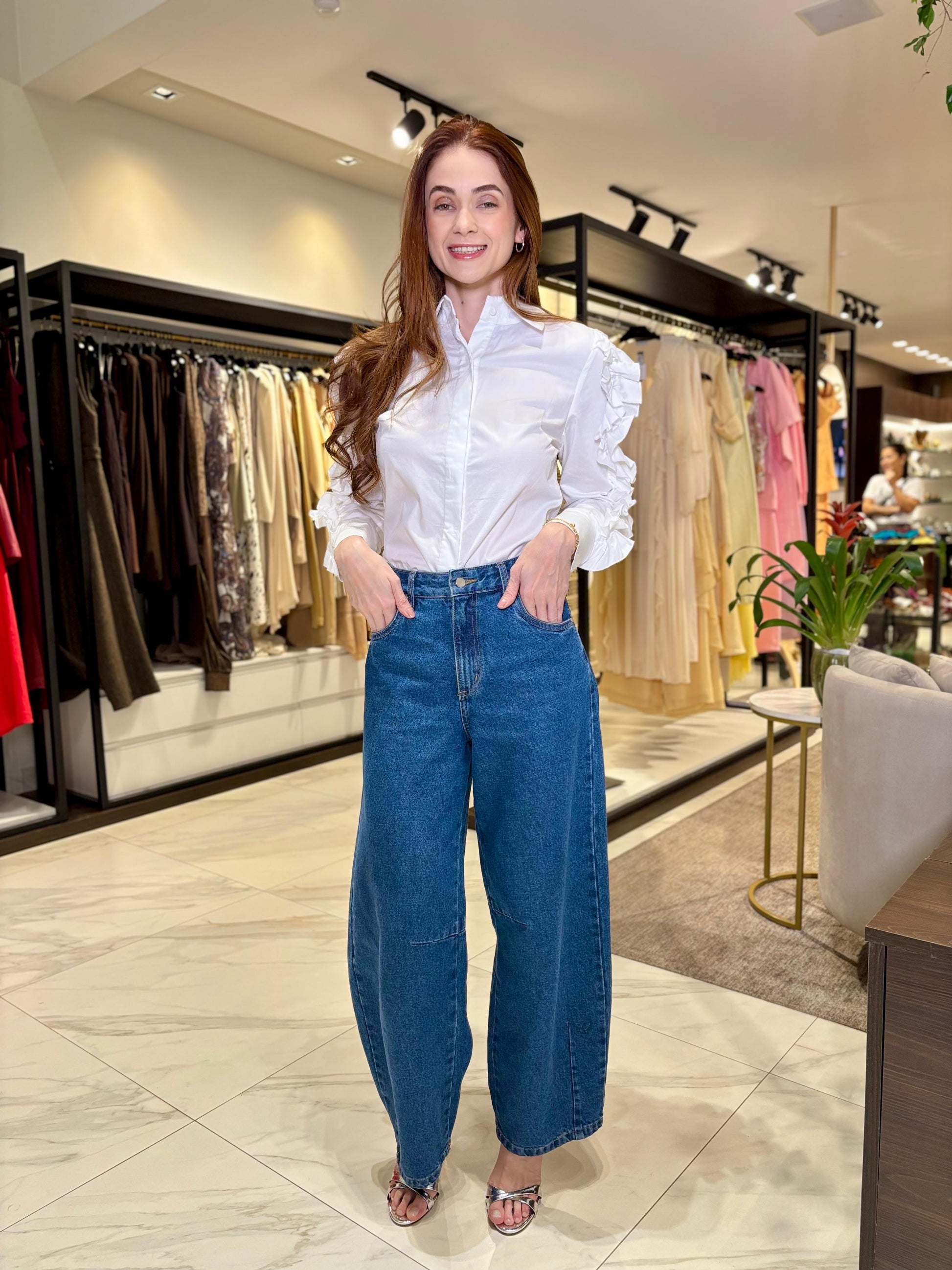 Camisa branca em tecido estruturado com caimento impecável. Possui gola tradicional, fechamento frontal por botões e destaque para as mangas com aplicação de babados, que adicionam um toque feminino e moderno à peça. Ideal para looks elegantes e versáteis.