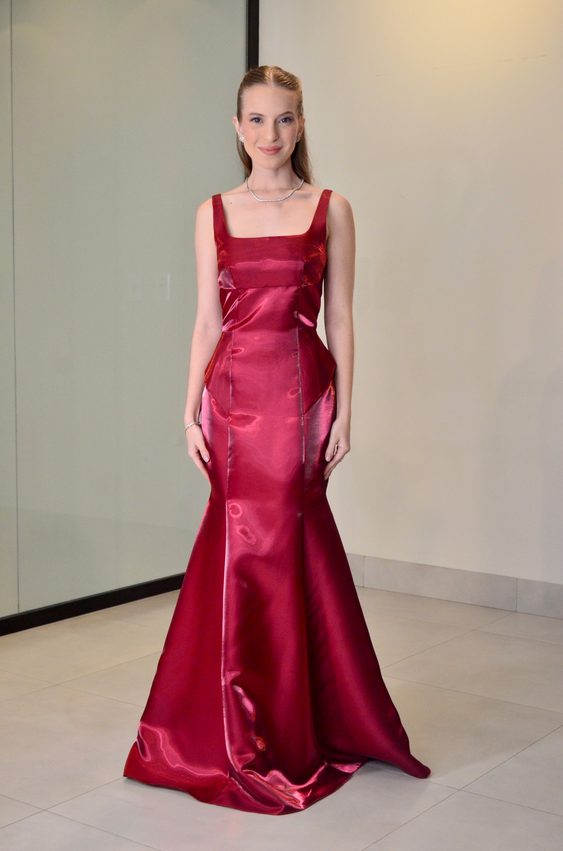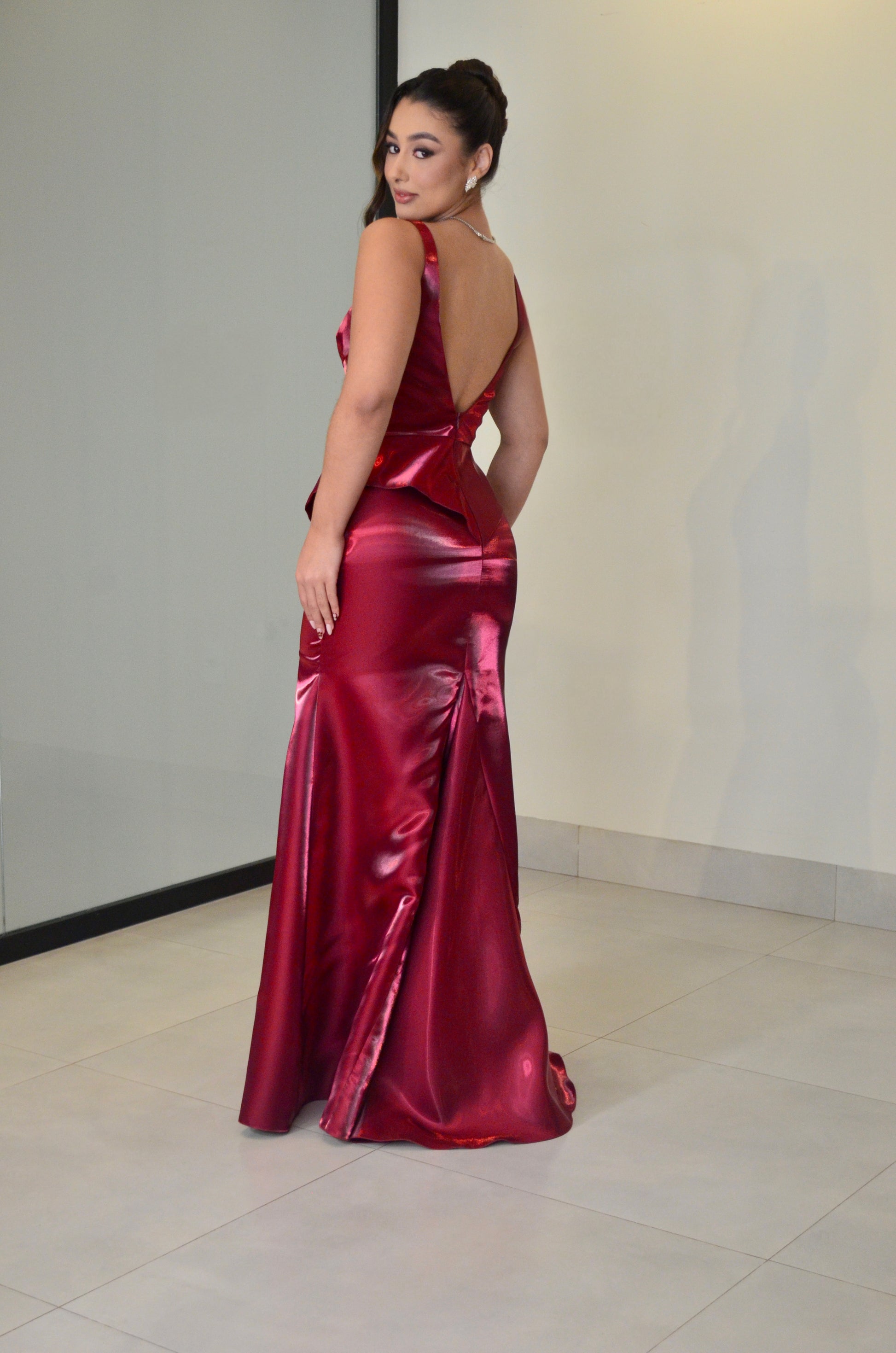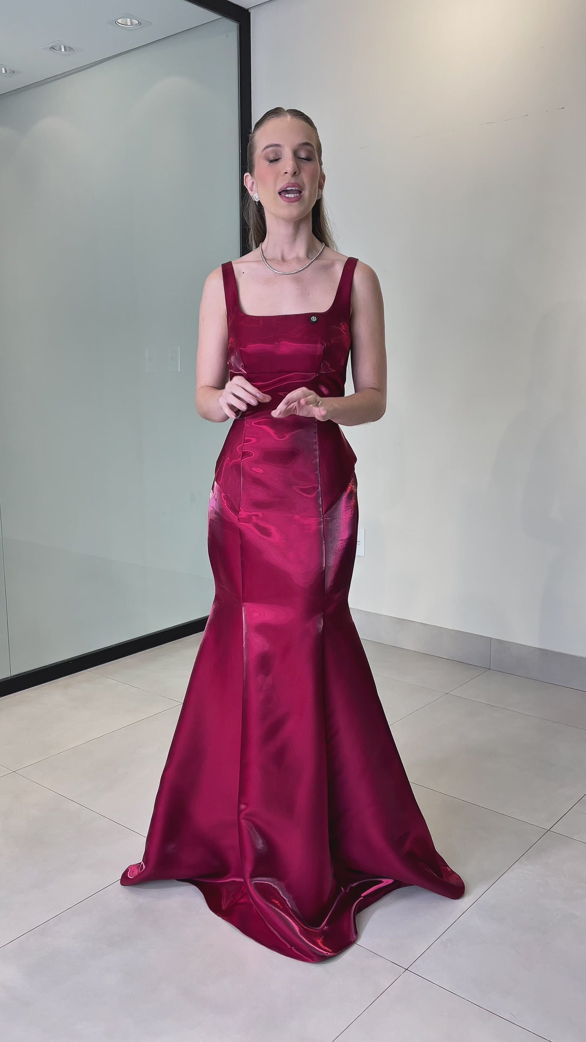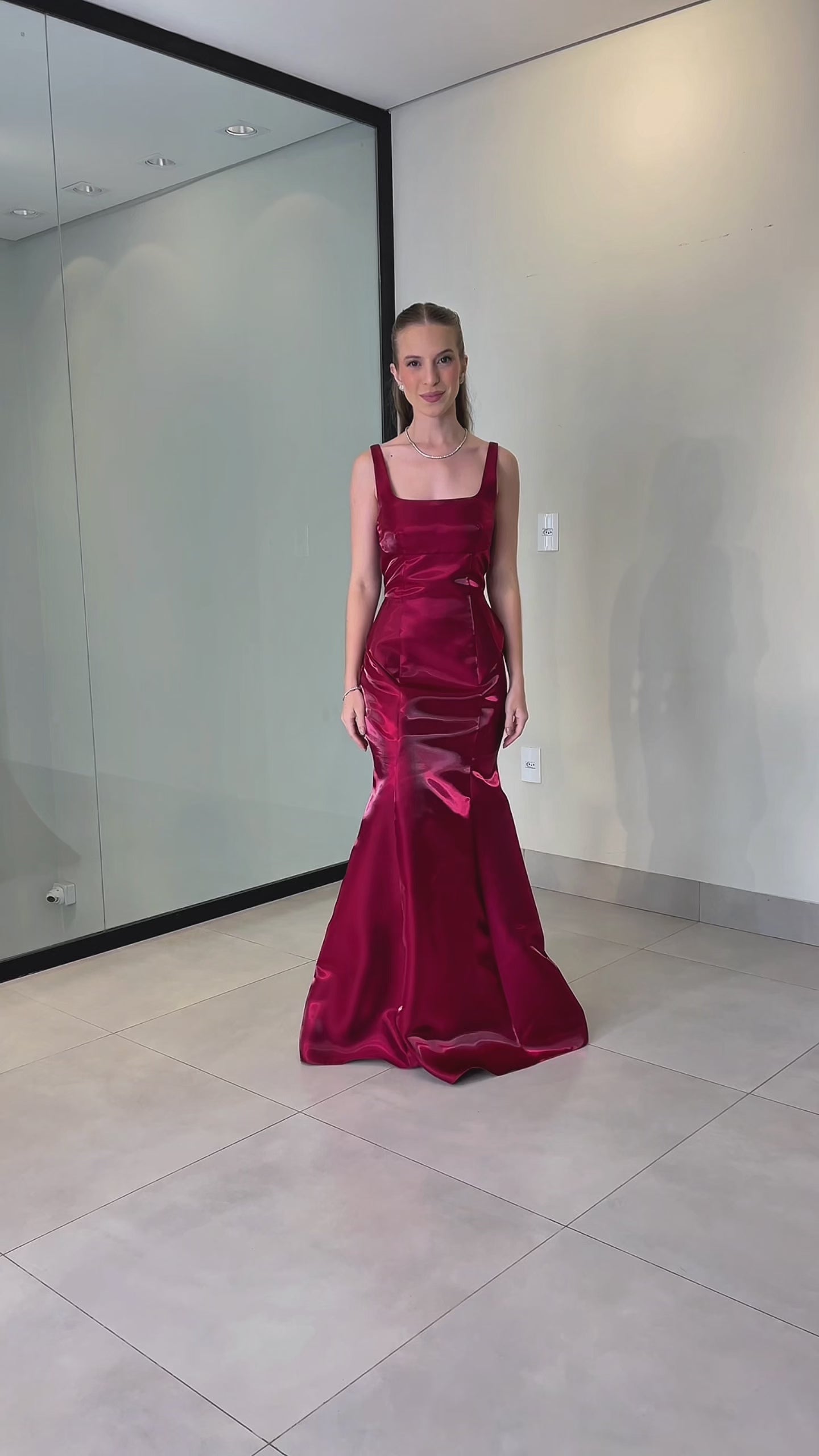 Vestido bordô feito em tecido acetinado com efeito gloss, ele possui alças largas e decote quadrado que conferem um visual moderno e estruturado à parte frontal. A modelagem ajustada ao corpo é valorizada por detalhes em peplum nas laterais, que acentuam a cintura e criam uma silhueta escultural. Nas costas, o vestido apresenta um decote em “V”, que adiciona sensualidade e equilíbrio ao design.