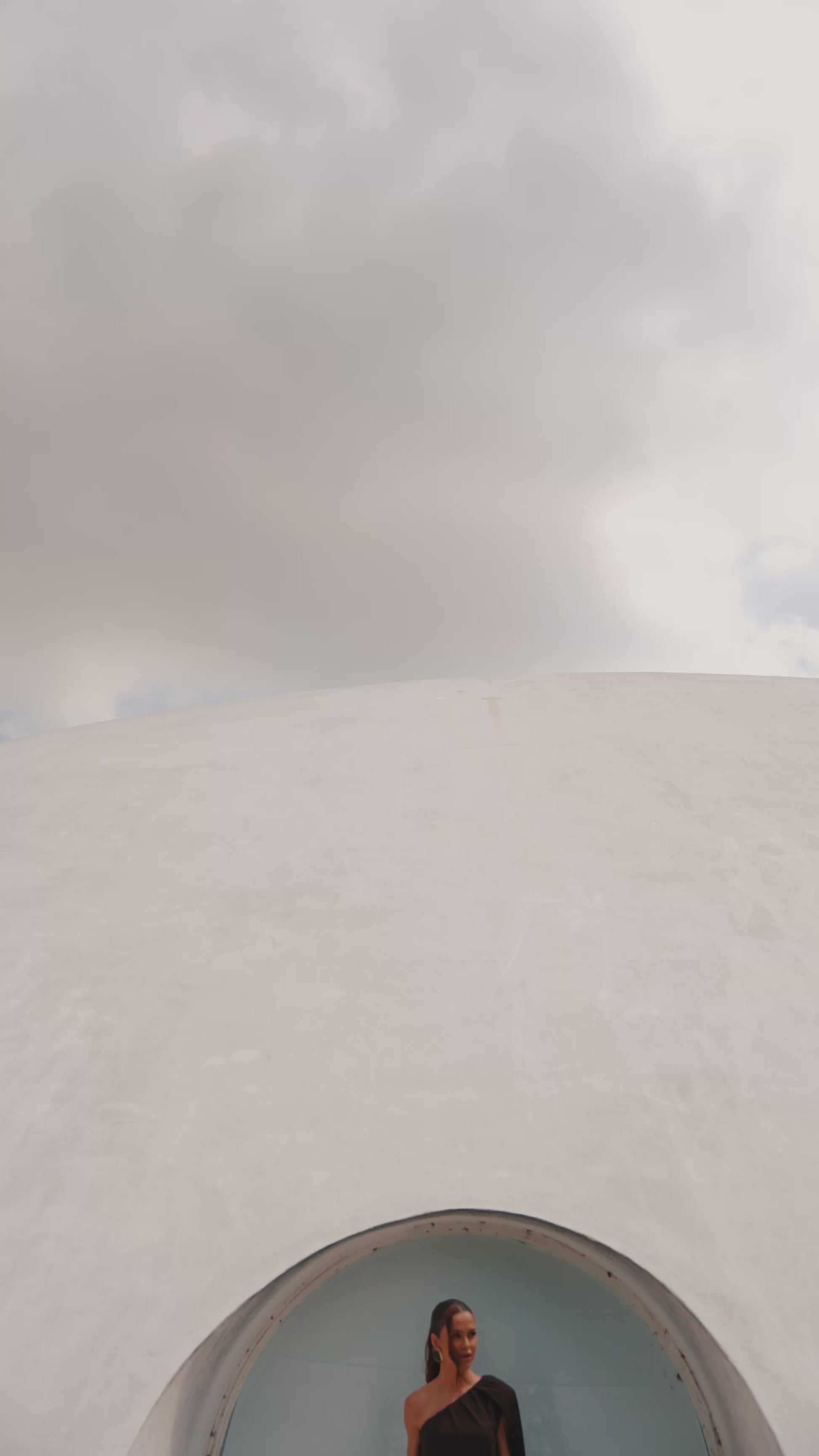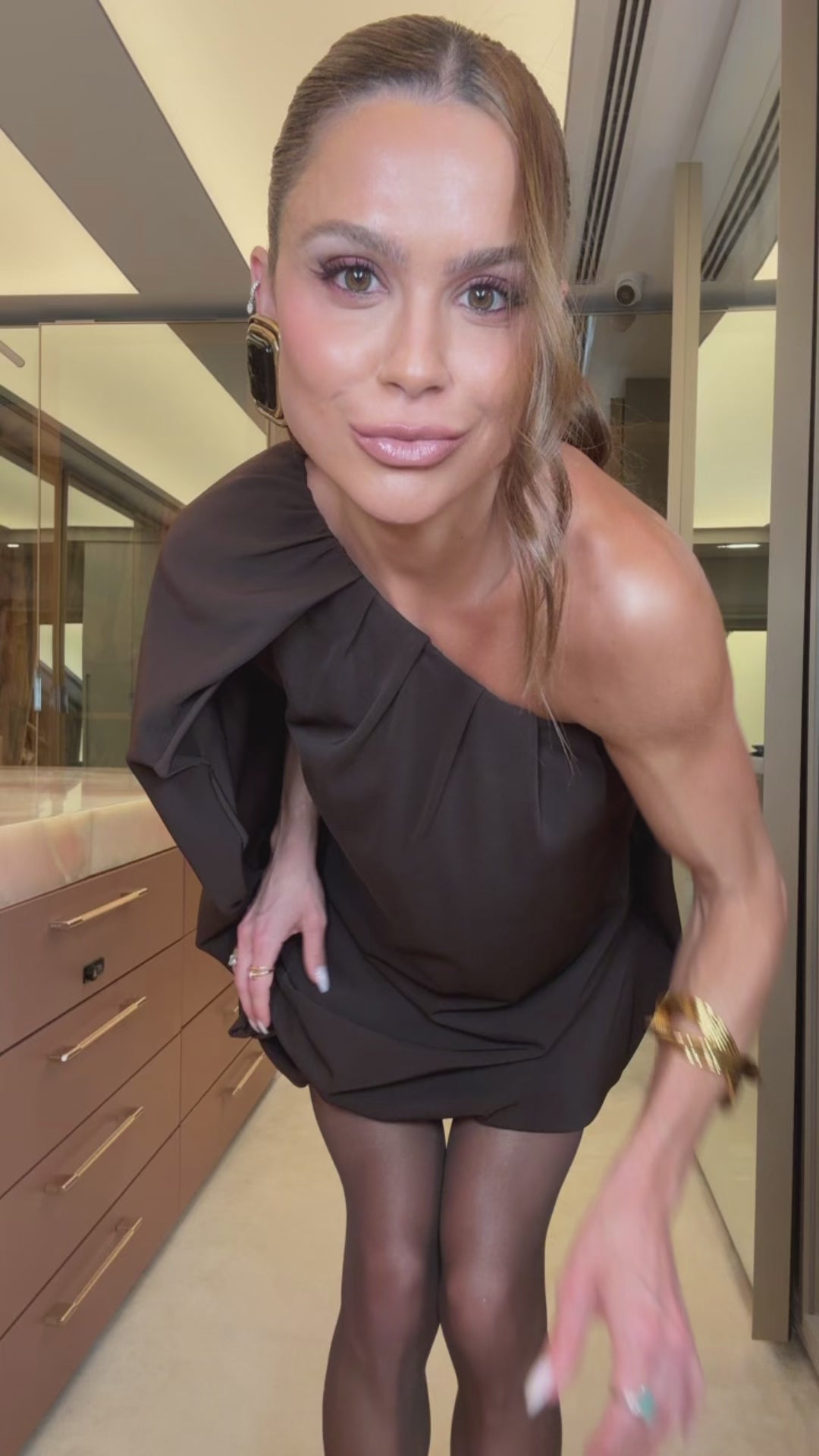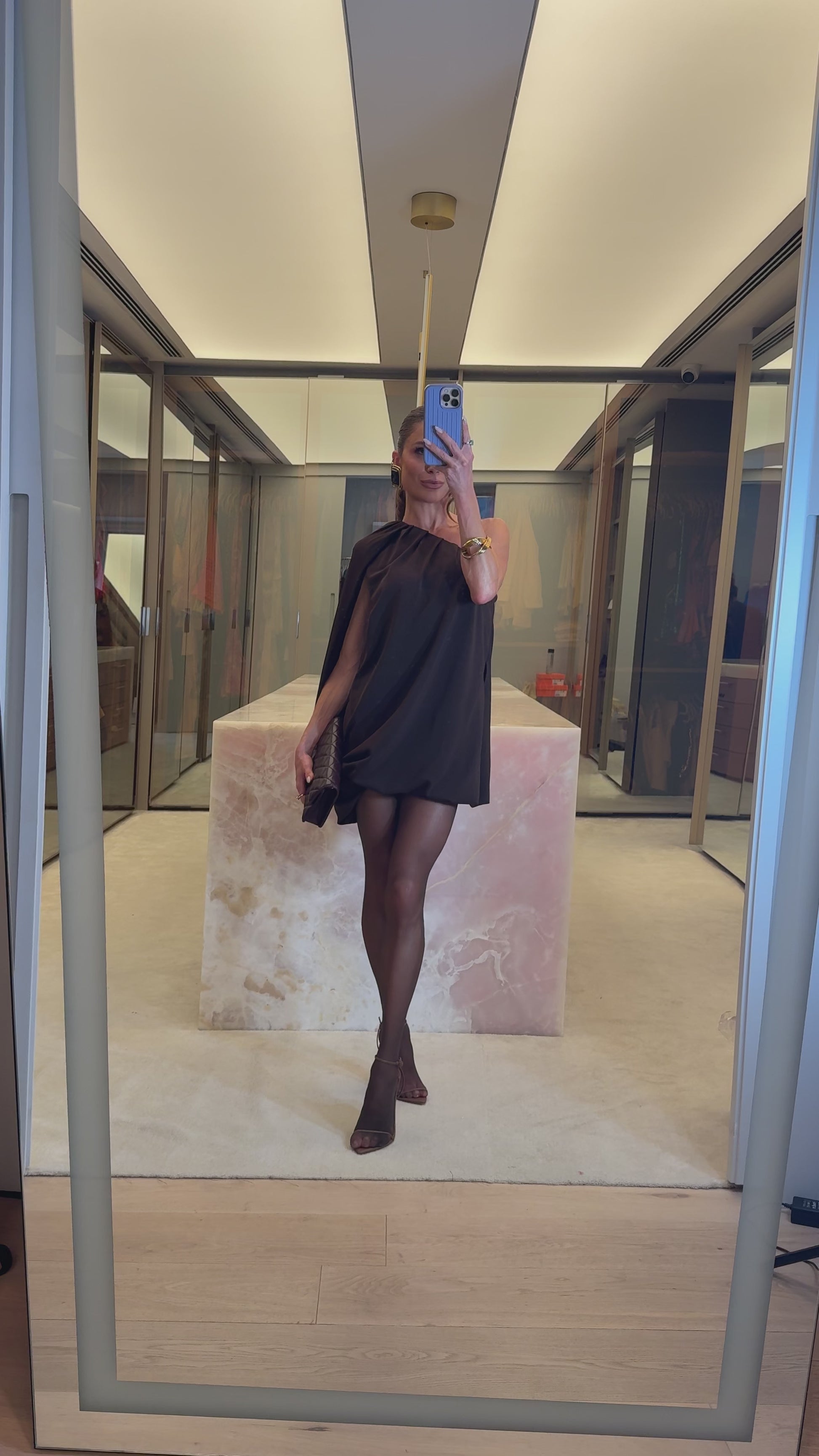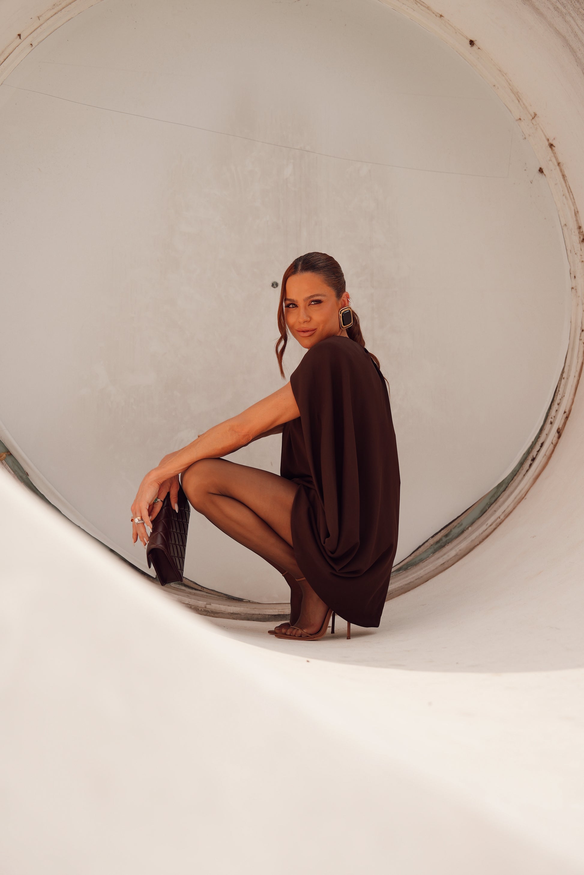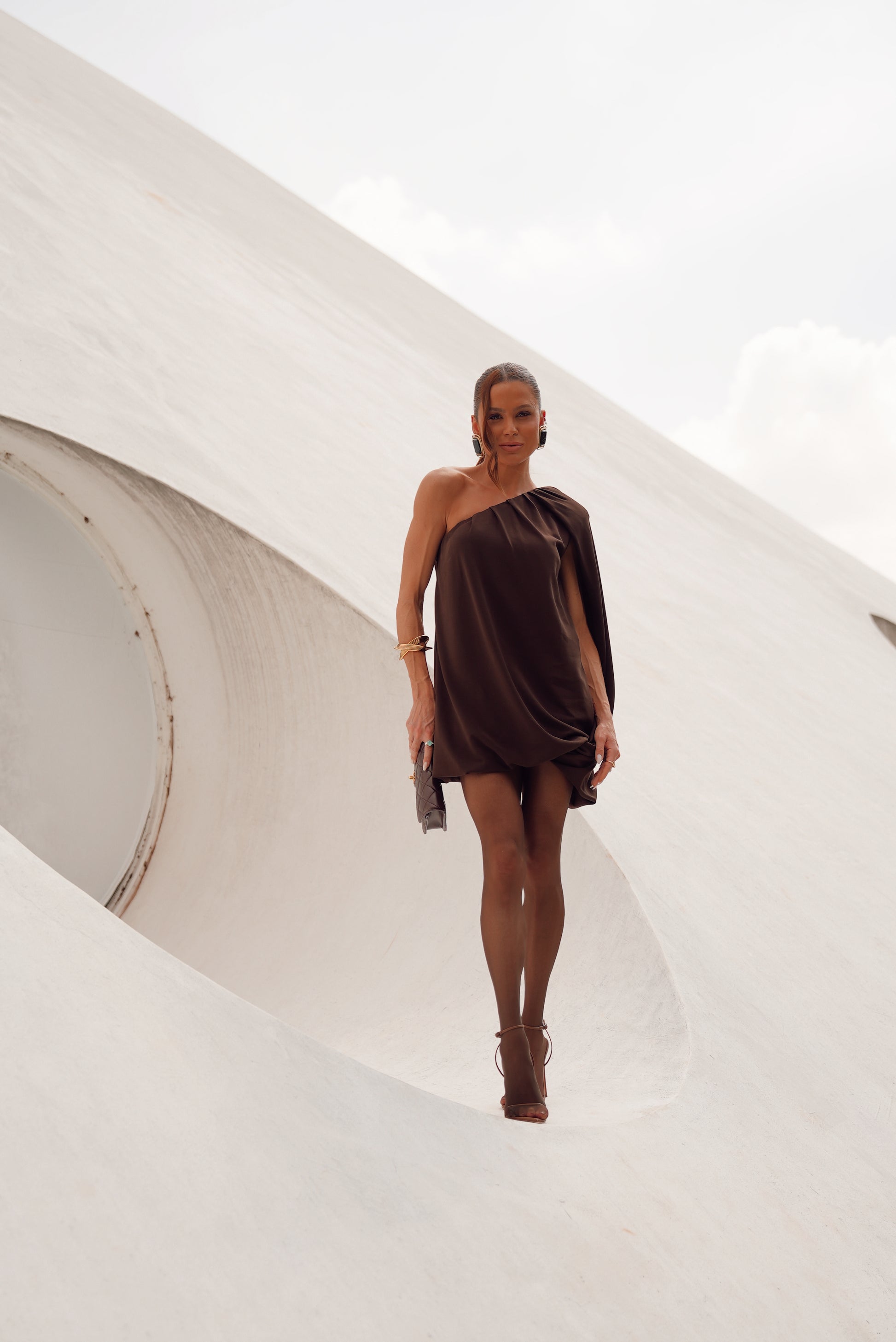 Vestido balonê curto e de um ombro só, confeccionado em tecido marrom com caimento leve e elegante. Possui uma modelagem solta e drapeada, criando um visual sofisticado e moderno.