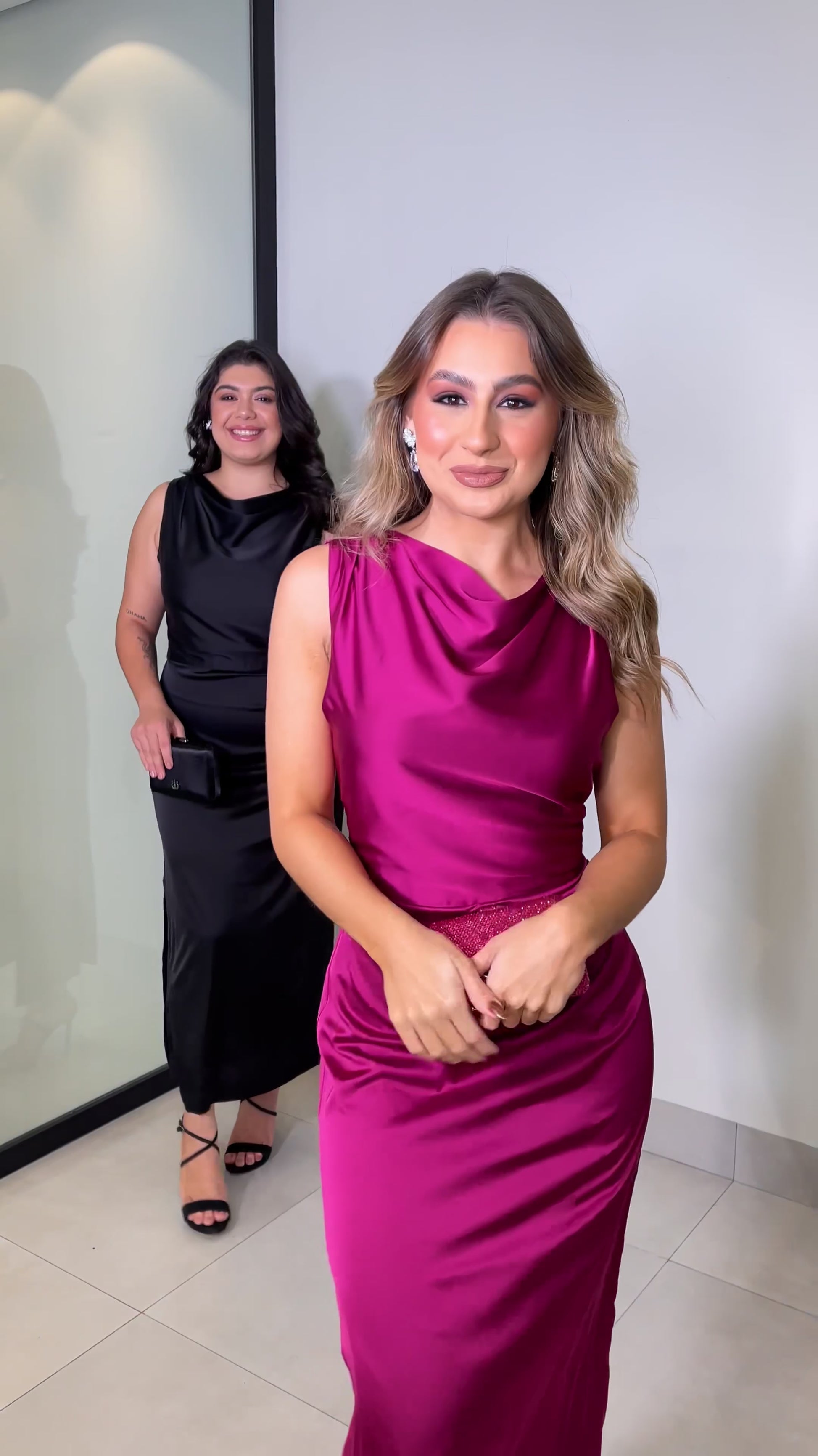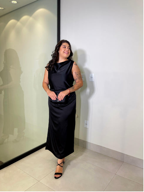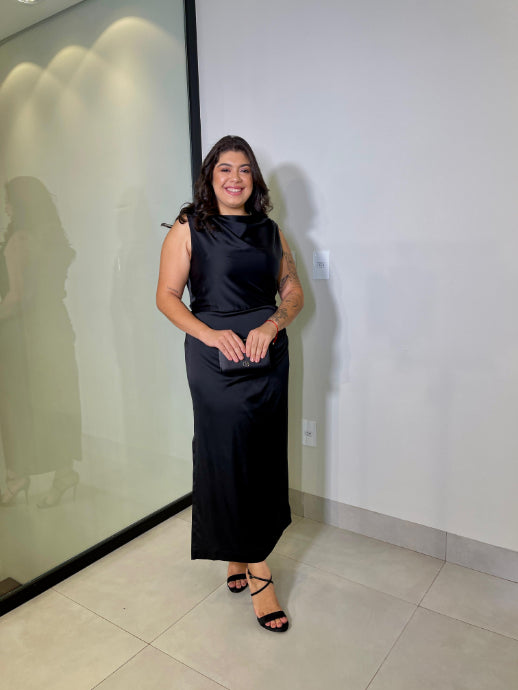 Vestido com design clássico e elegante. Possui recorte reto e detalhes de alças largas nas costas, com um franzido desde o centro das costas até o quadril e zíper invisível. A peça valoriza a silhueta, trazendo destaque para a marcação na cintura, e se soltando de forma fluida no seu comprimento.