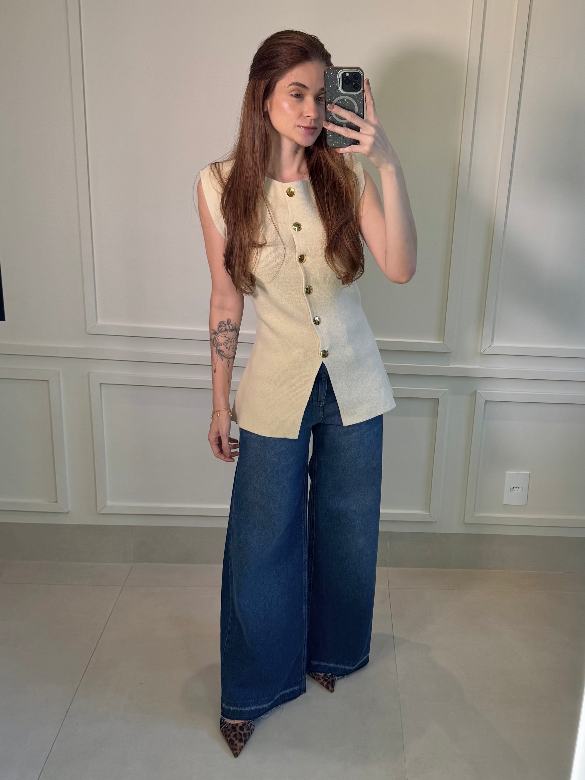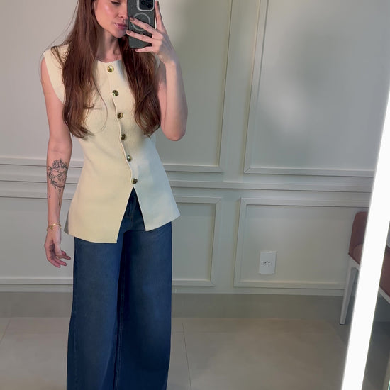 Colete com ombreiras marcantes e fechamento frontal com botões dourados. O design elegante é valorizado pelo recorte central na barra, que traz modernidade à peça. Versátil e atemporal, é ideal para composições que vão do casual ao sofisticado. Disponível em duas tonalidades claras.