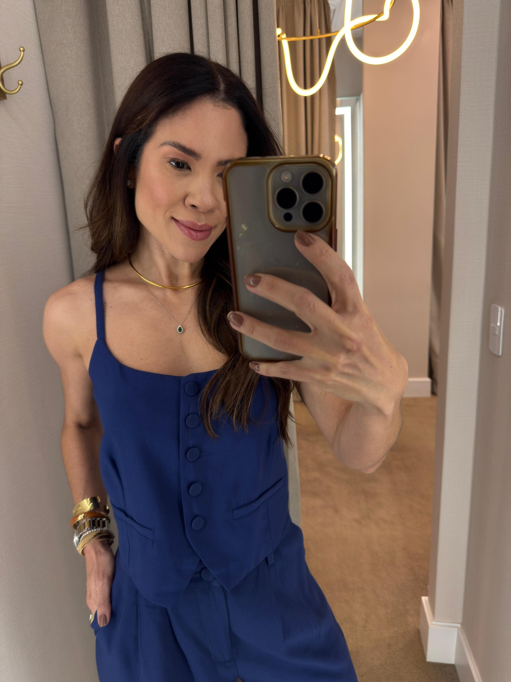 Blusa bege estilo colete com alças finas e decote quadrado. O modelo possui botões frontais forrados e recortes que valorizam a silhueta. Uma peça moderna e versátil para compor looks elegantes com facilidade.