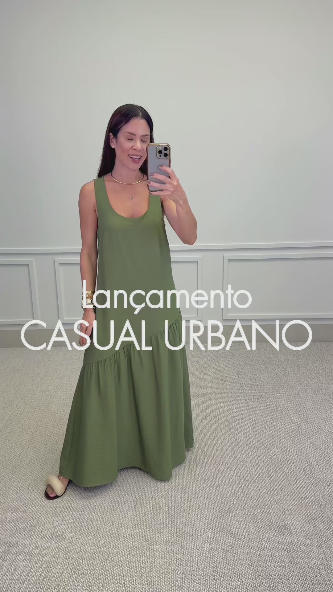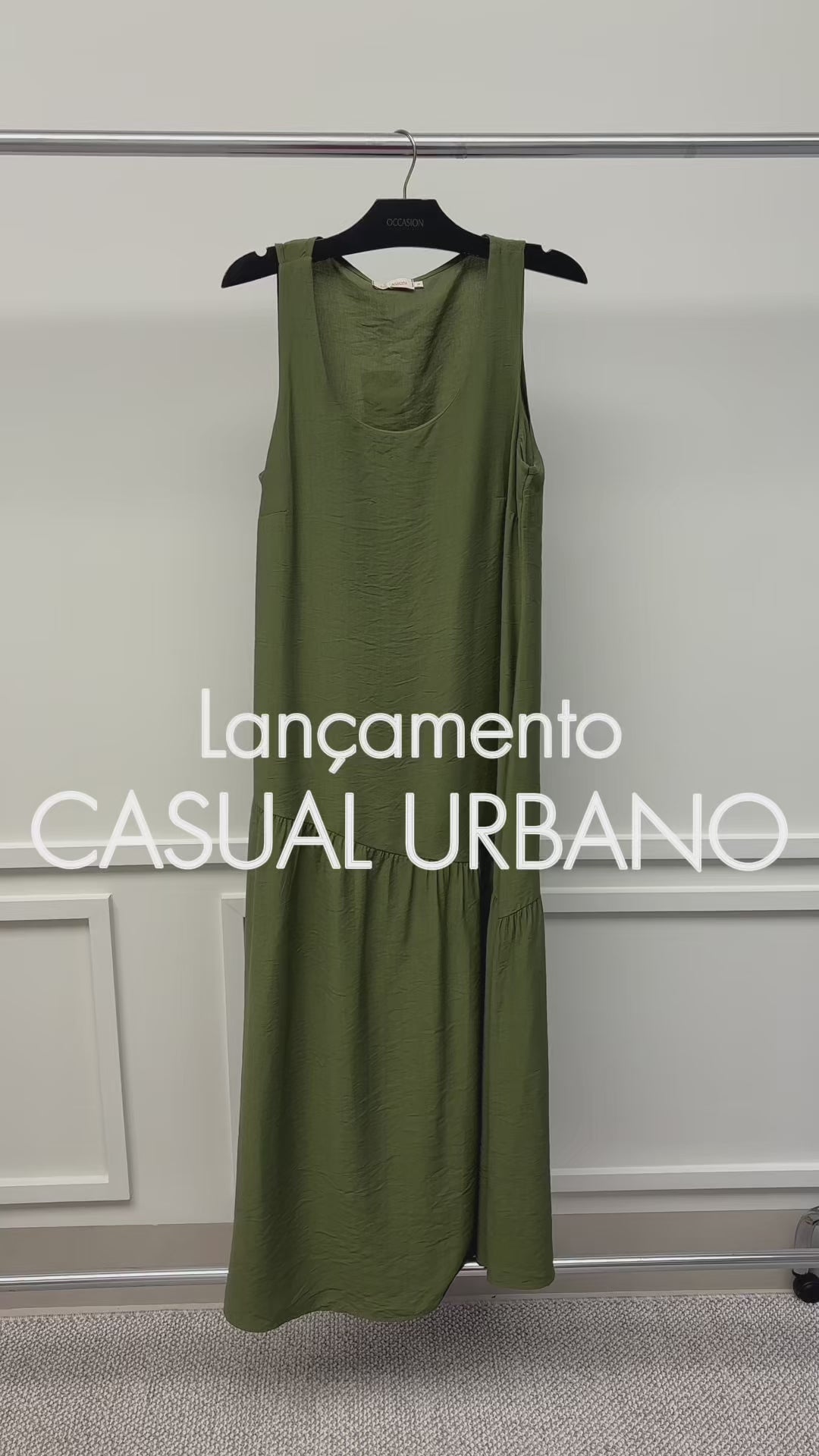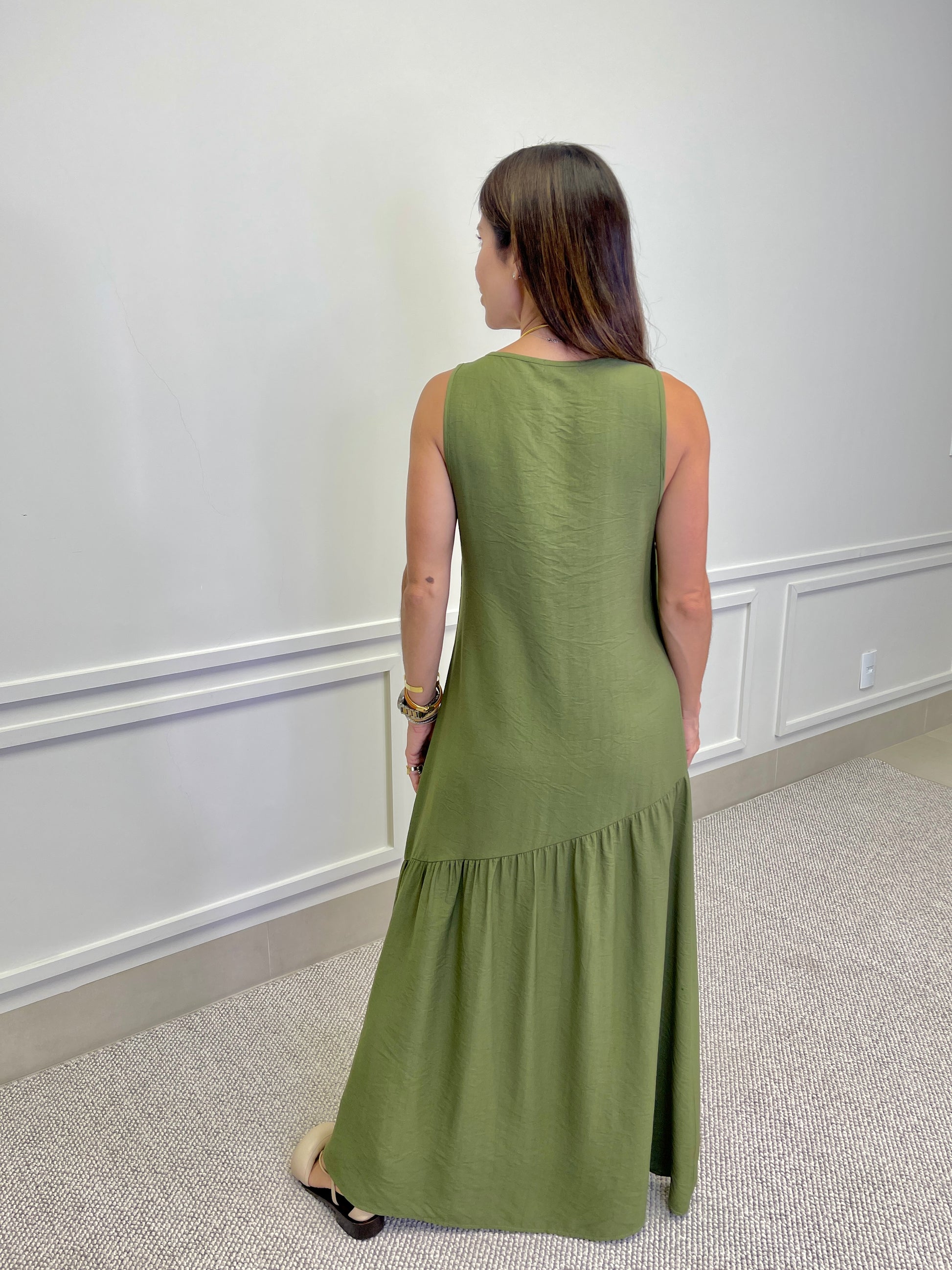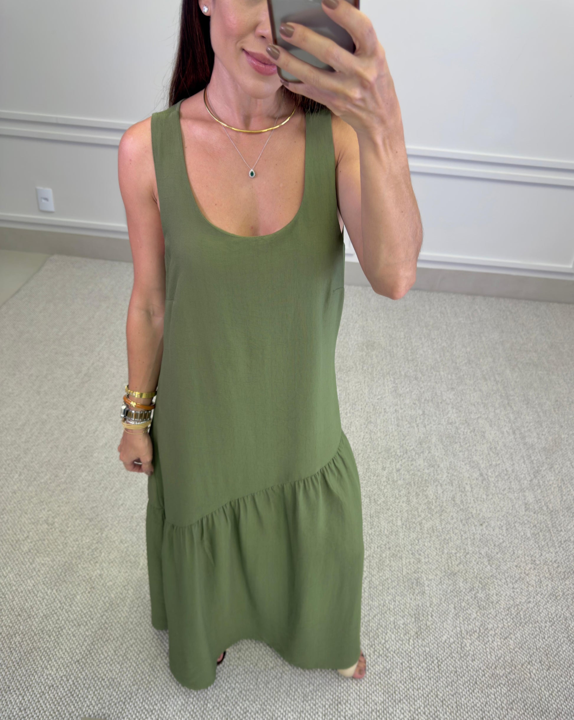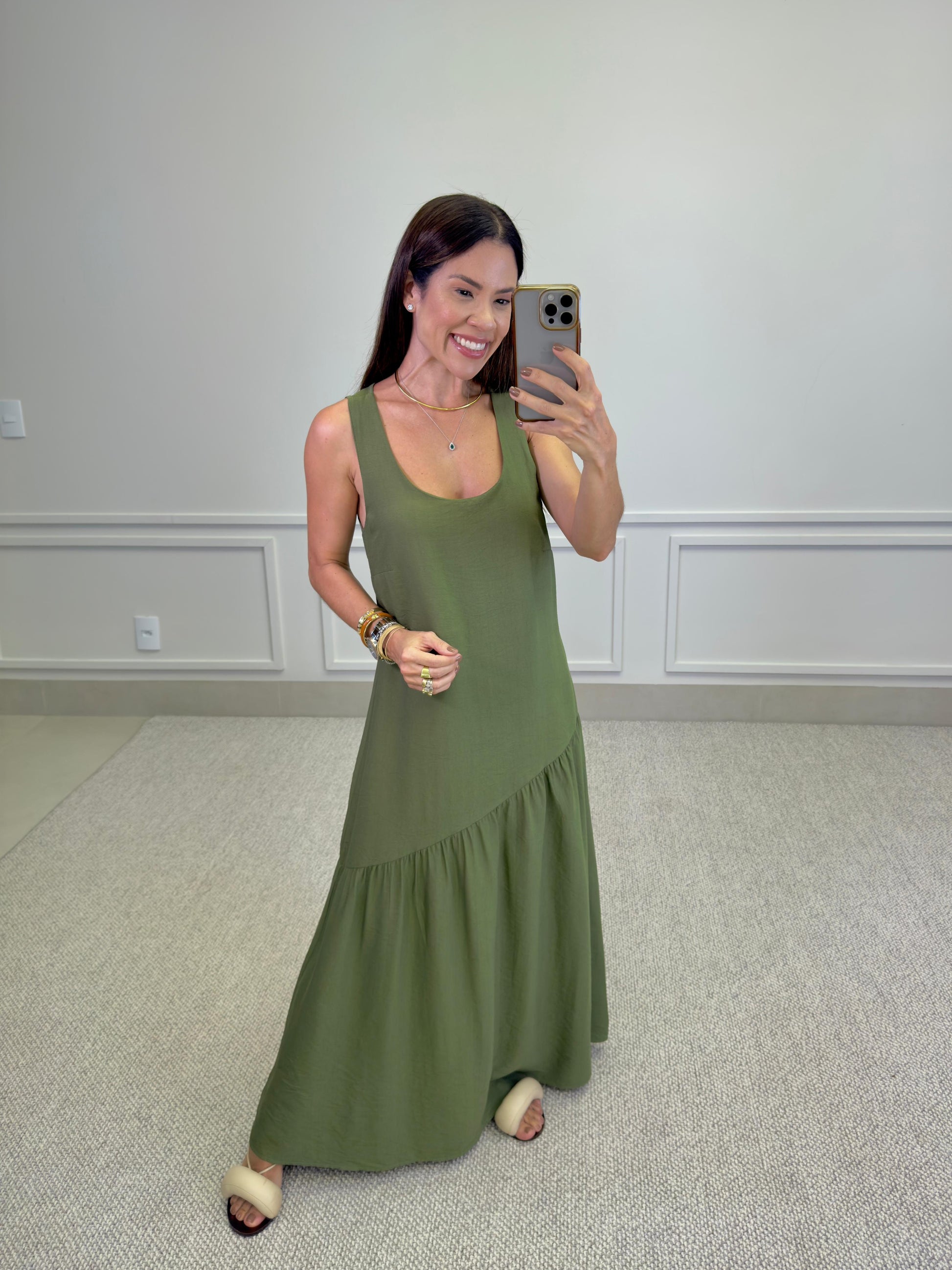 Vestido longo verde oliva estilo regata, possui com largas e decote arredondado. Possui corte fluido e confortável, com um detalhe assimétrico e pregas na parte frontal.