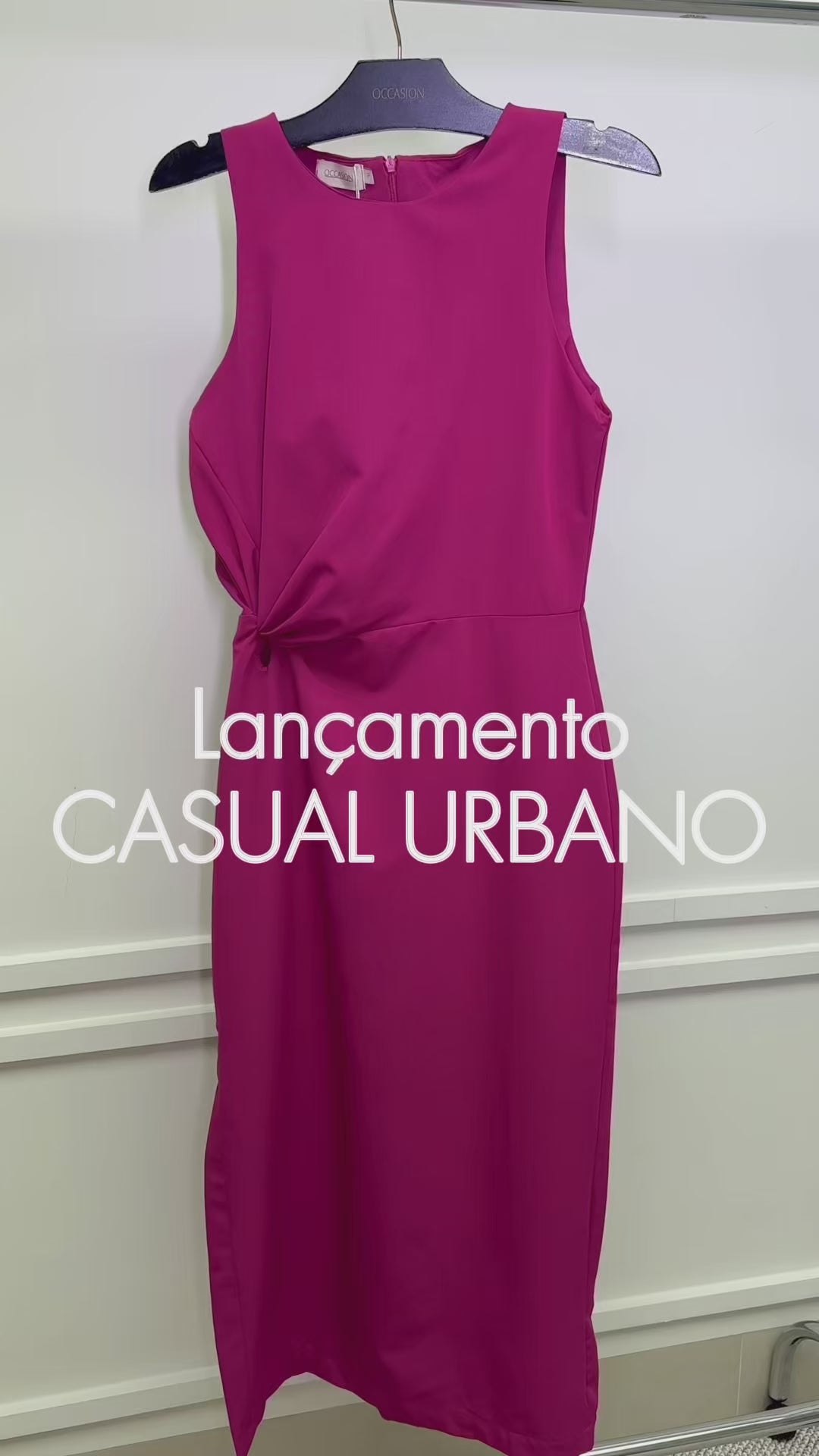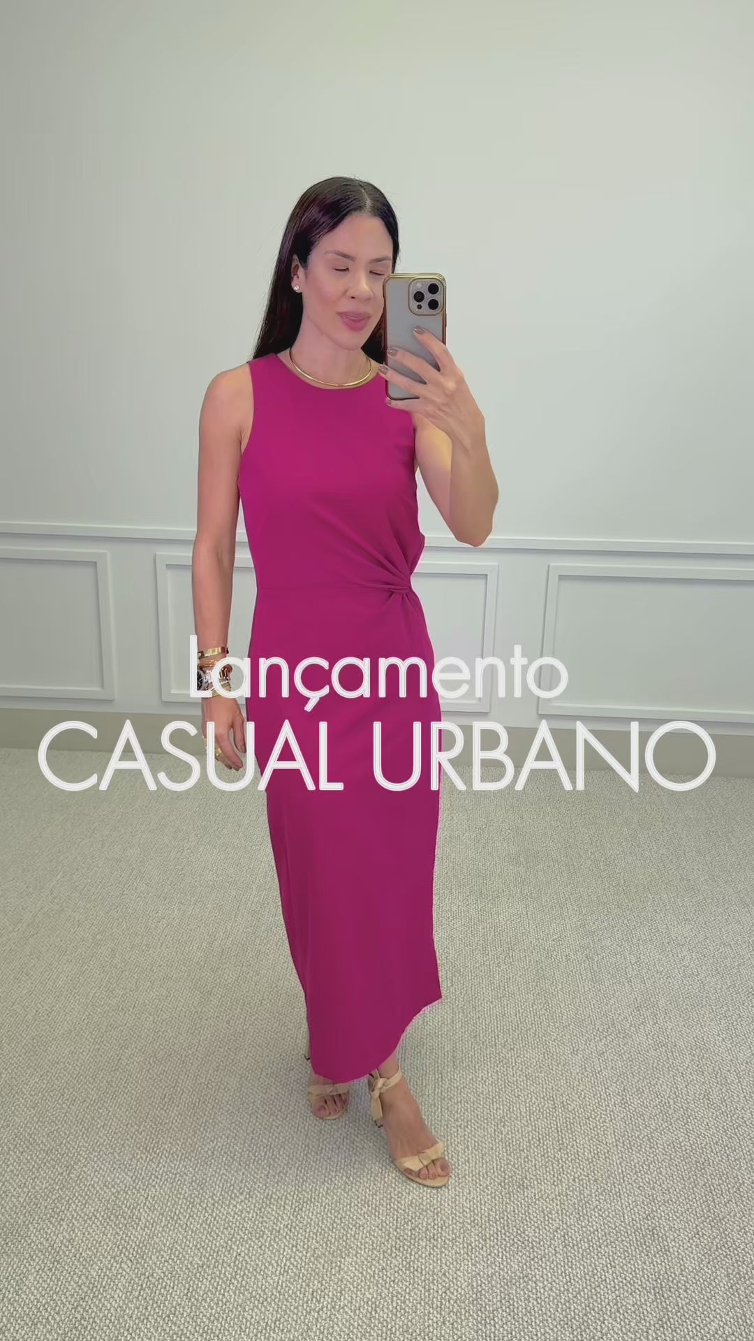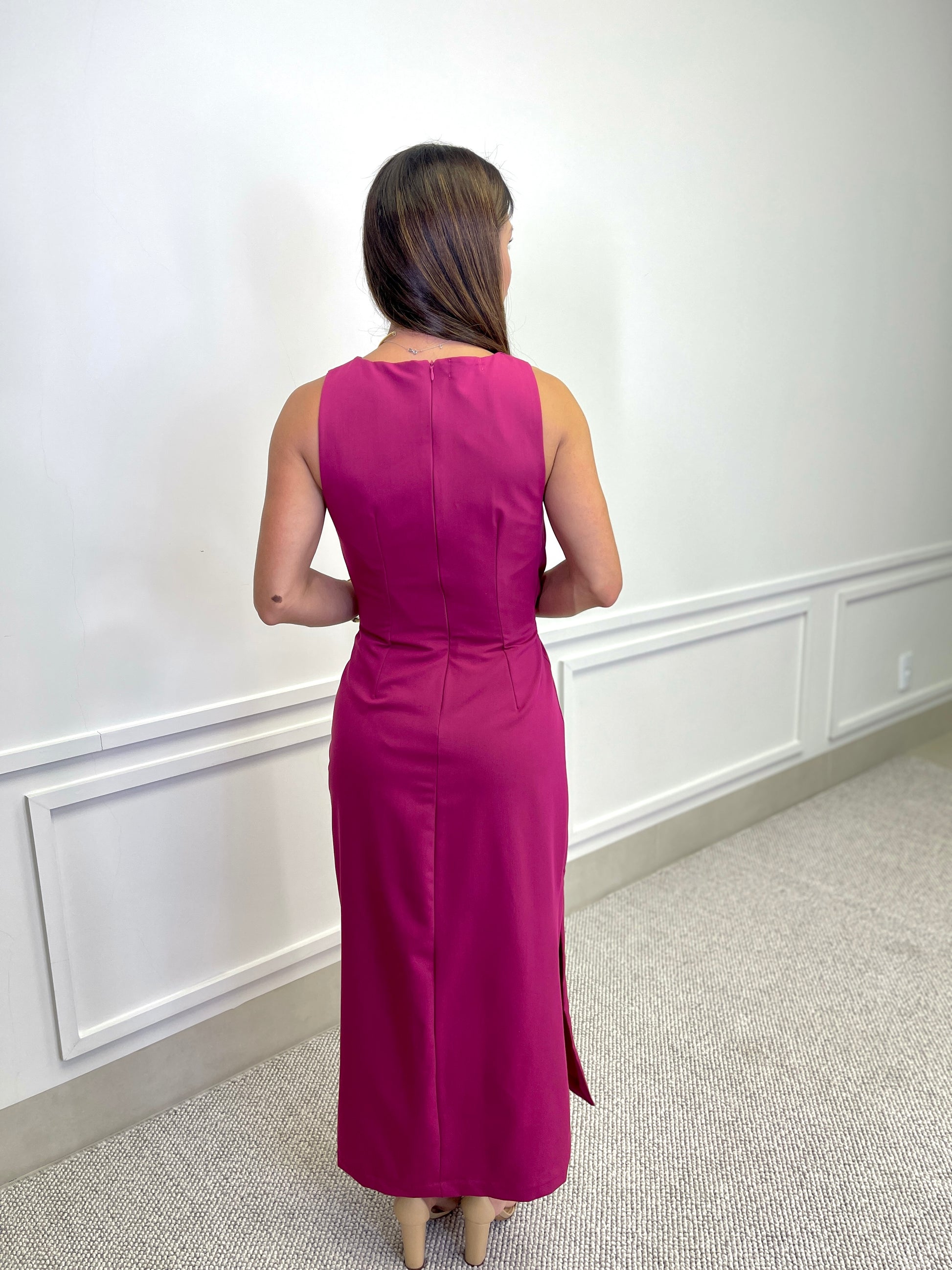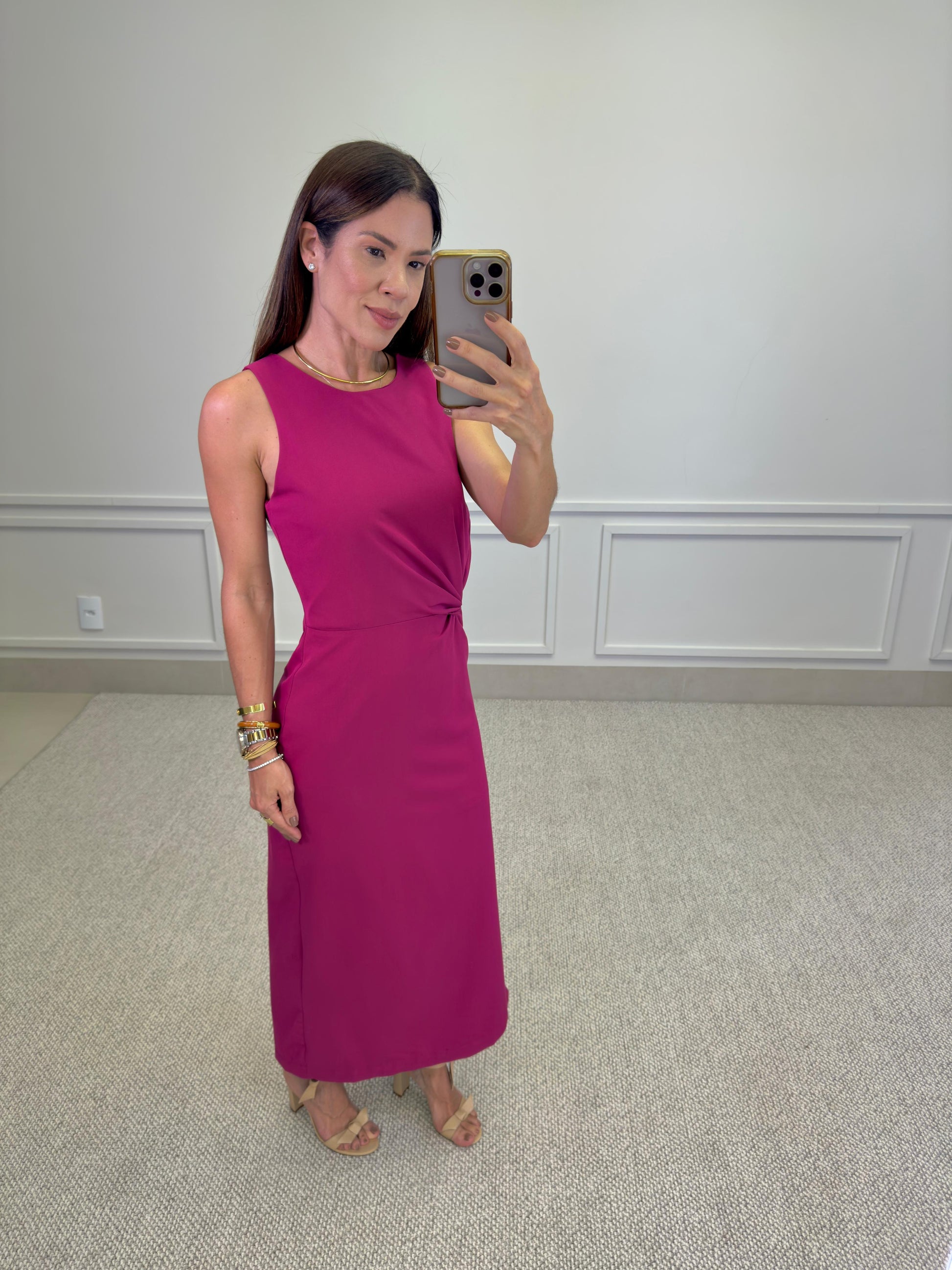 Vestido midi fúcsia, sem mangas. Possui detalhe torcido na cintura que valoriza a silhueta, modelagem ajustada, fenda lateral e zíper nas costas. Elegante e moderno na medida certa!