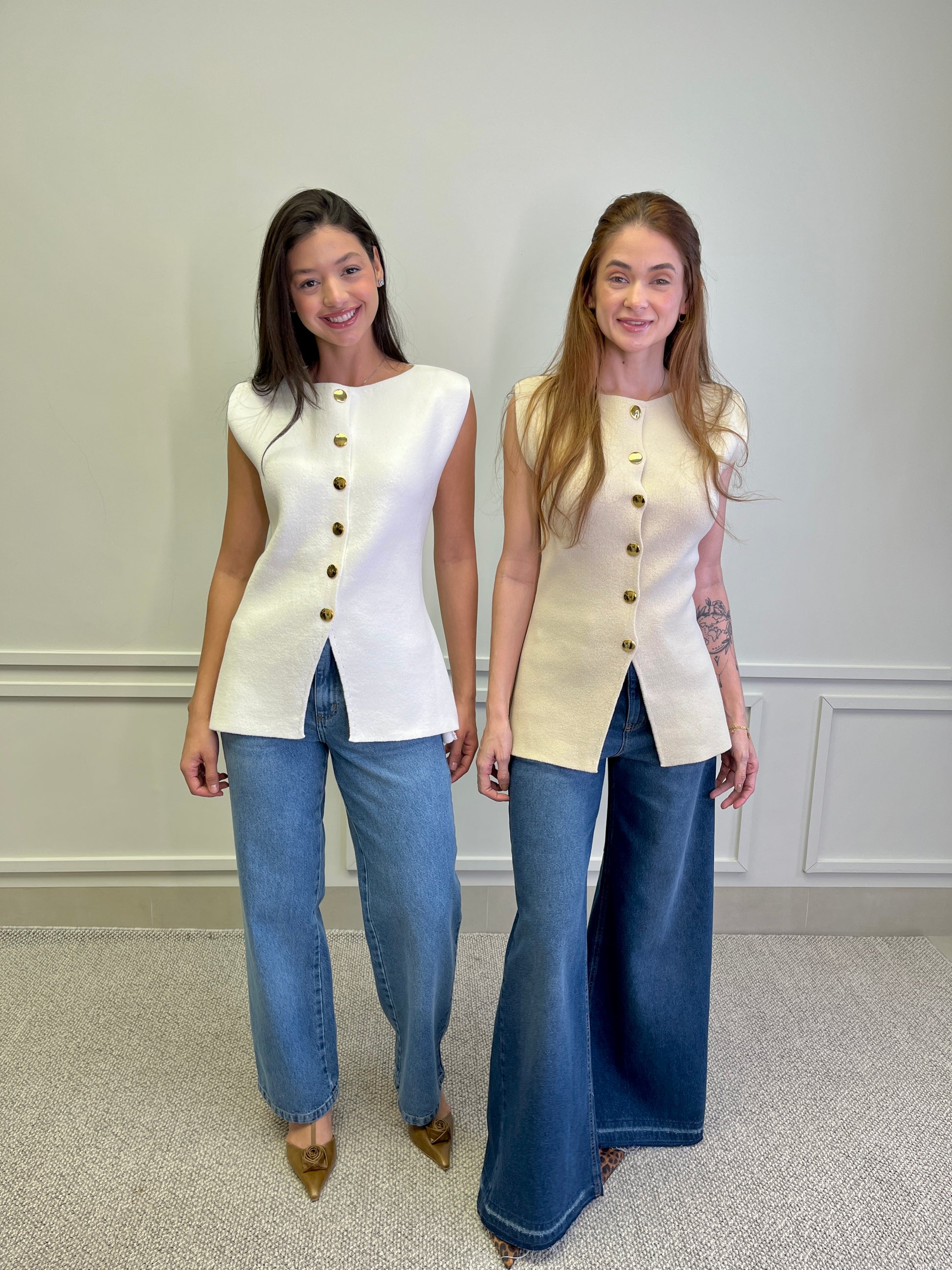 Colete com ombreiras marcantes e fechamento frontal com botões dourados. O design elegante é valorizado pelo recorte central na barra, que traz modernidade à peça. Versátil e atemporal, é ideal para composições que vão do casual ao sofisticado. Disponível em duas tonalidades claras.