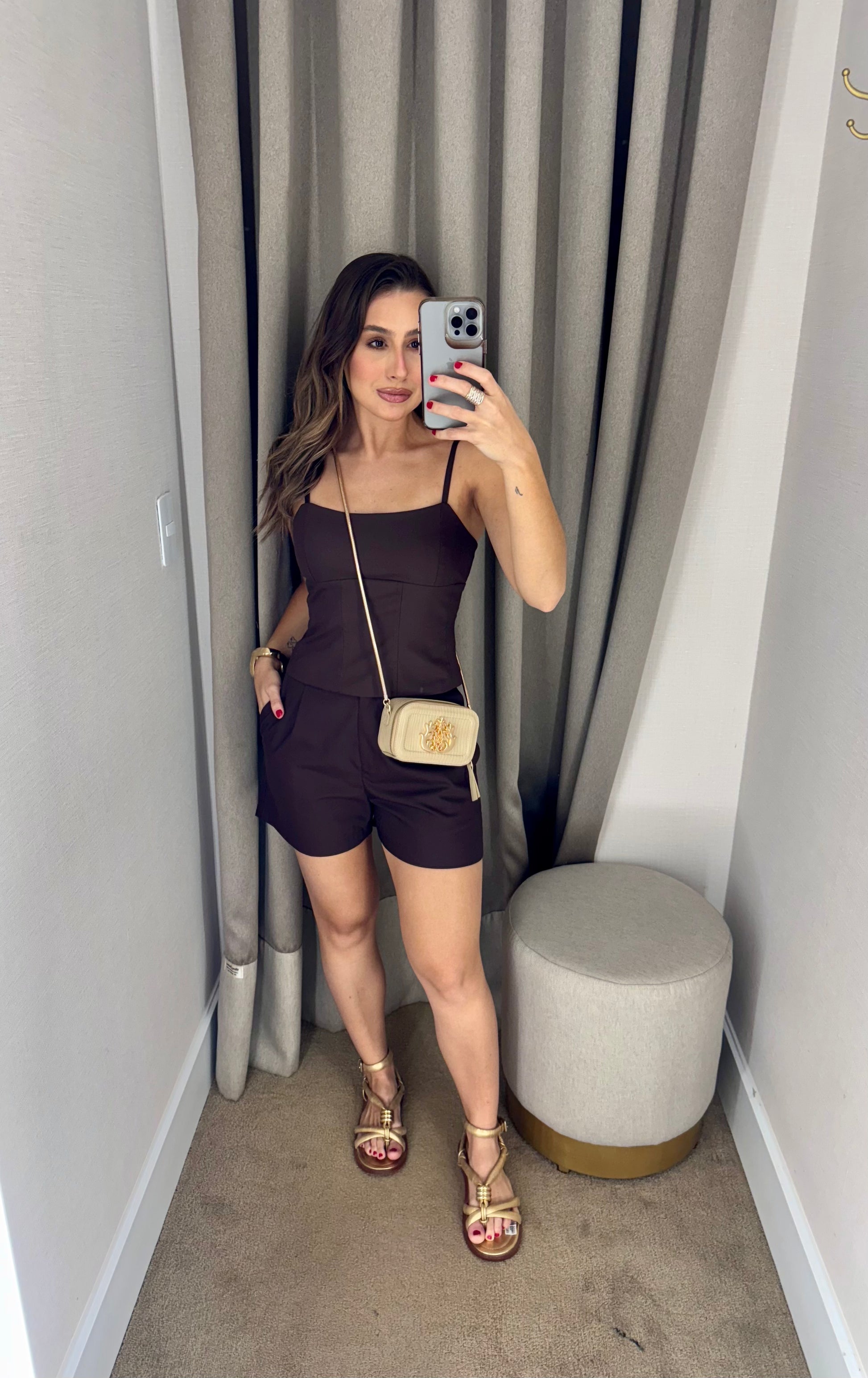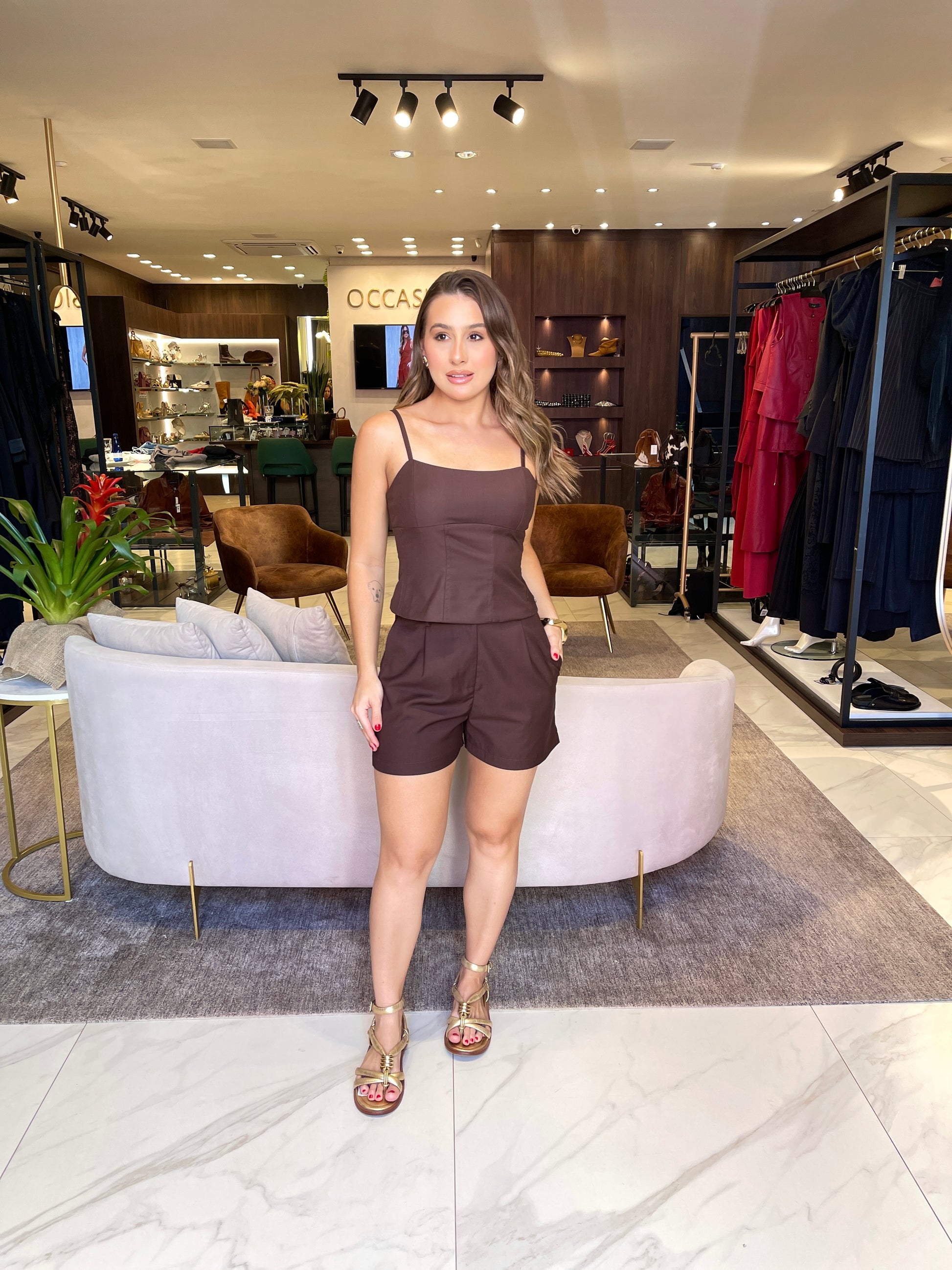 Shorts marrom em alfaiataria, possui botão invisível, bolsos frontais, pregas e cintura alta que valorizam a silhueta.