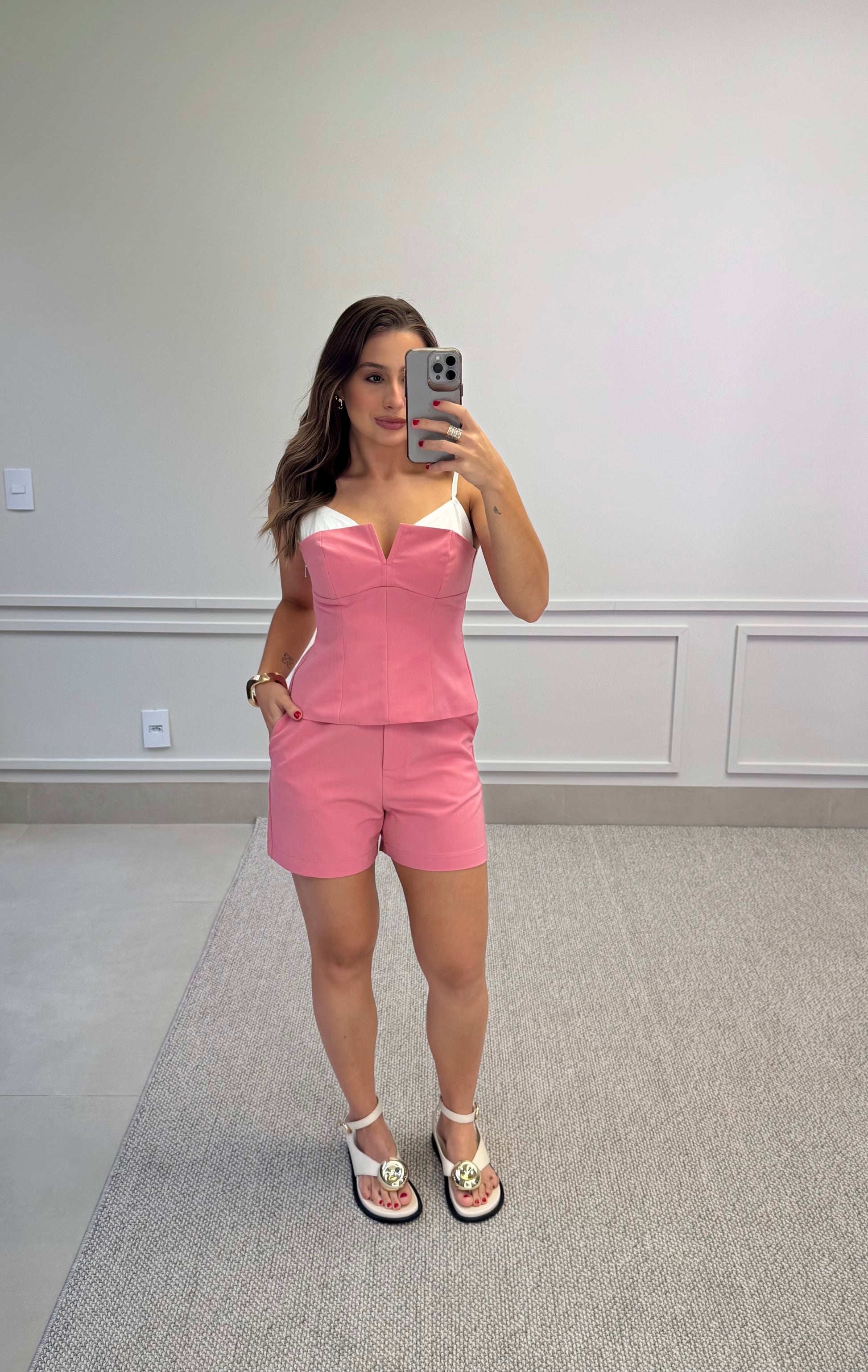 Blusa rosa em alfaiataria com alças reguláveis, leve decote em V com detalhe em tecido branco que simula uma sobreposição.
