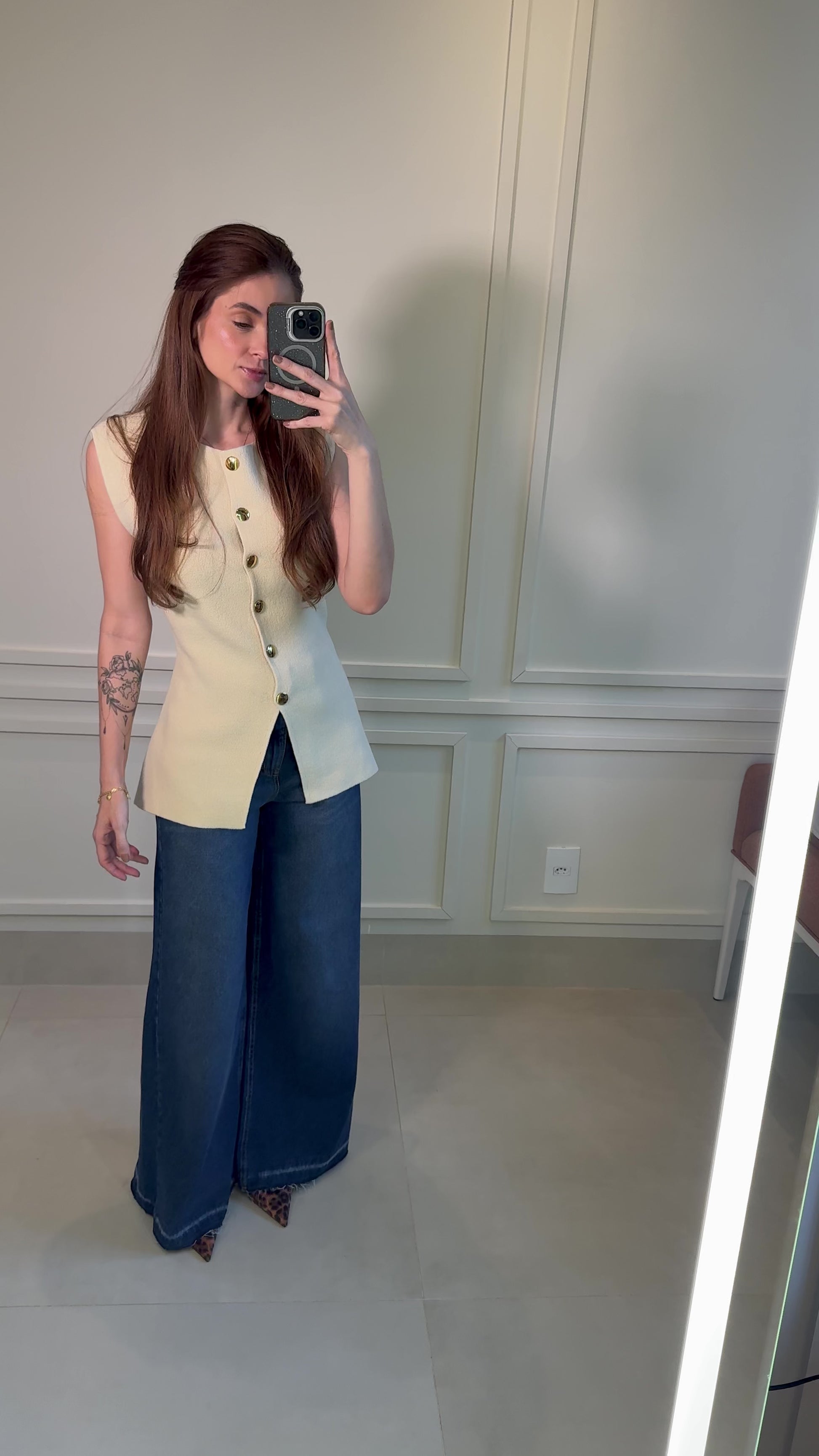 Colete com ombreiras marcantes e fechamento frontal com botões dourados. O design elegante é valorizado pelo recorte central na barra, que traz modernidade à peça. Versátil e atemporal, é ideal para composições que vão do casual ao sofisticado. Disponível em duas tonalidades claras.