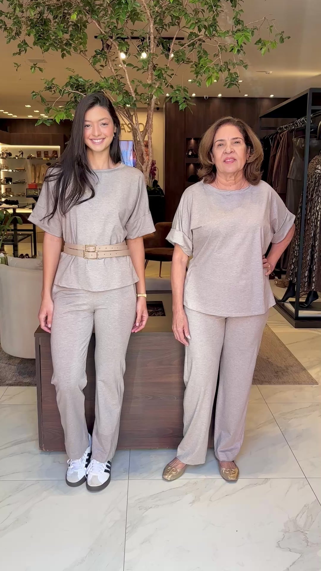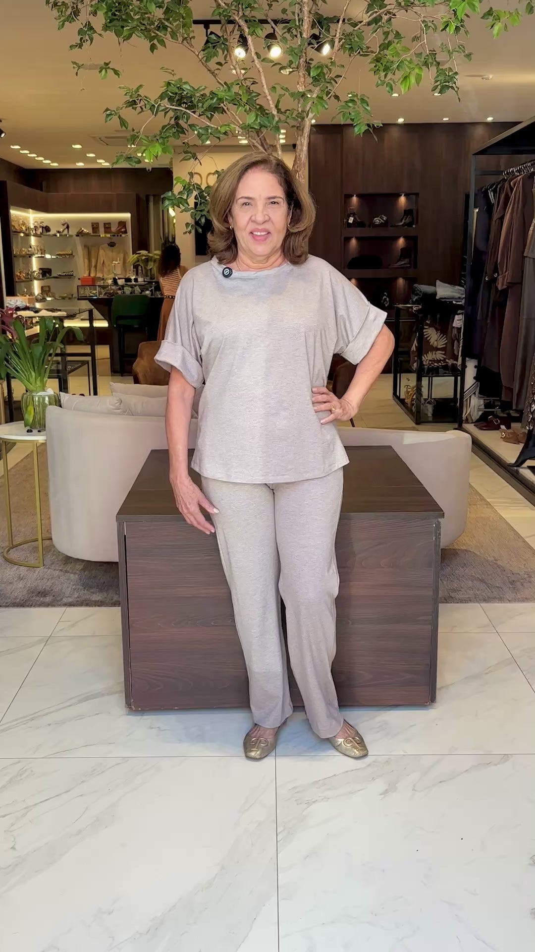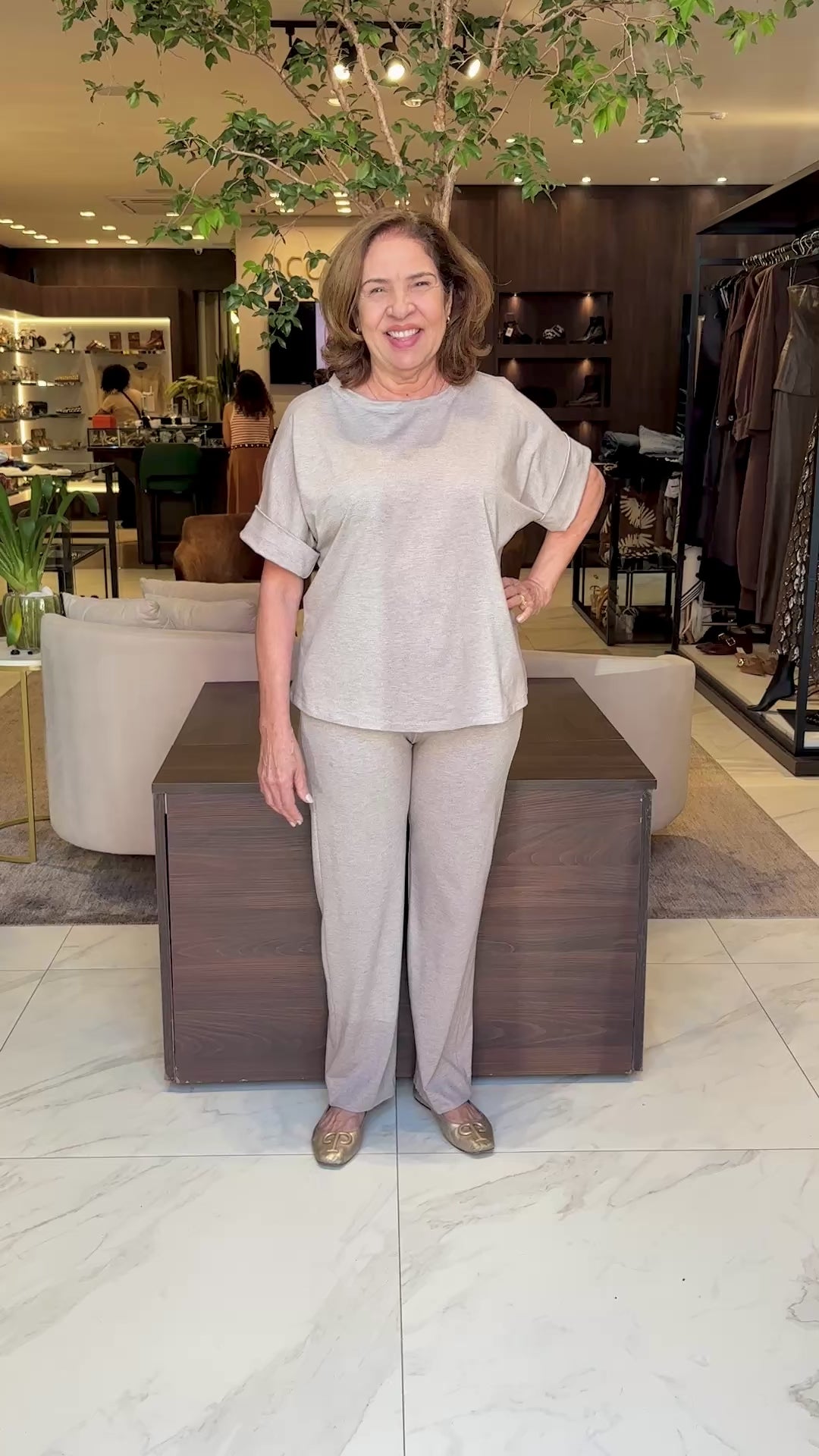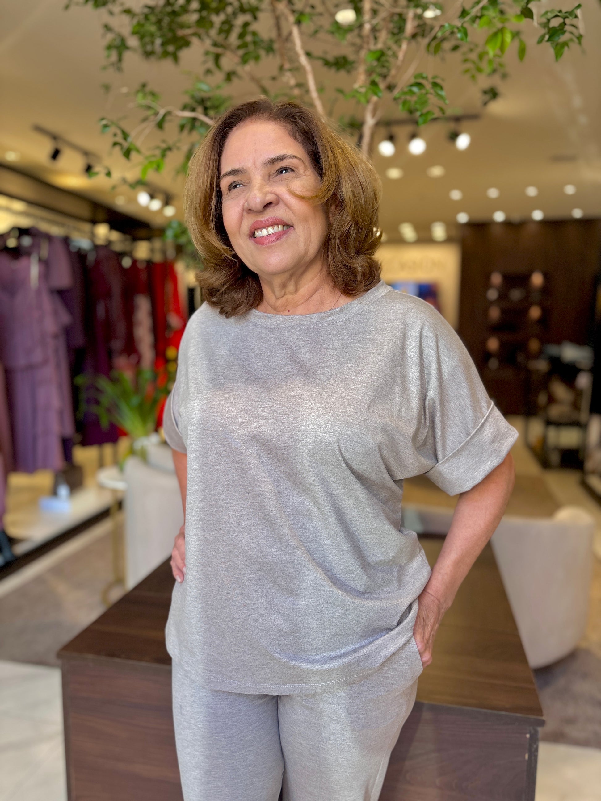 Conjunto cinza em malha que une sofisticação e praticidade com caimento leve e toque macio. A blusa de modelagem soltinha, com mangas dobradas, combina perfeitamente com a calça reta de cintura alta, criando um visual moderno e versátil. Ideal para ocasiões em que você quer estar bem-vestida sem abrir mão do conforto.