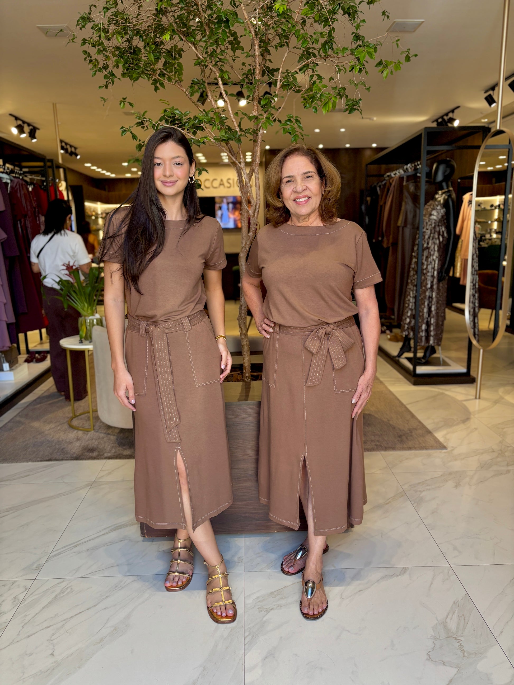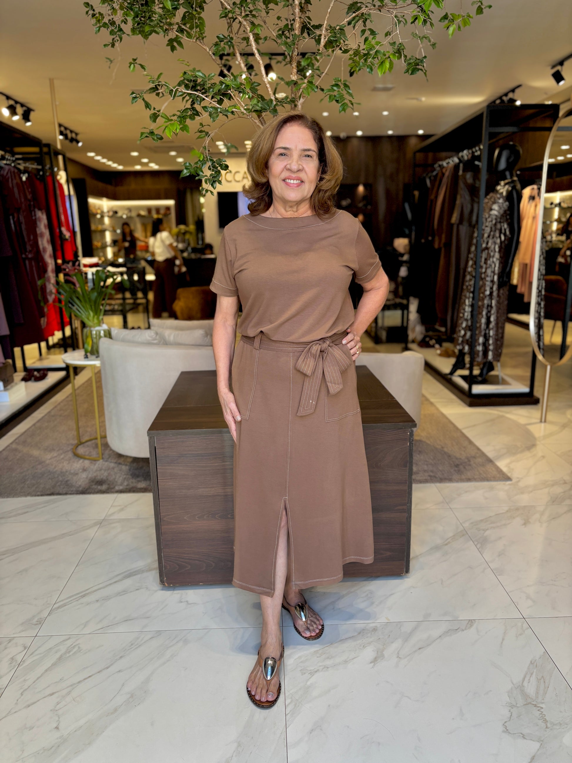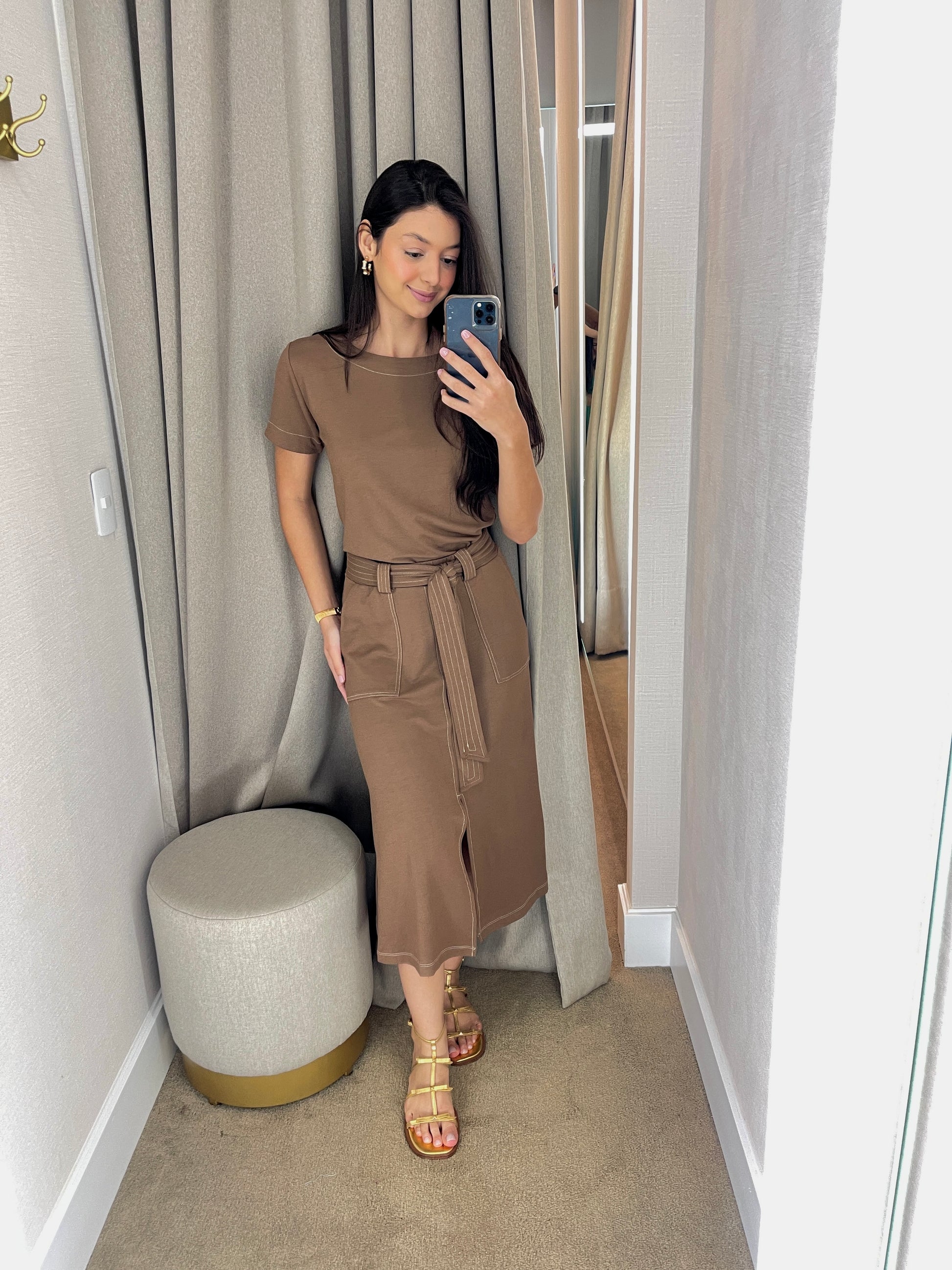 Conjunto em malha comfy composto por blusa de mangas curtas e saia midi com fenda frontal. A blusa tem modelagem reta e leve caimento no corpo, garantindo conforto e elegância no dia a dia. A saia possui amarração na cintura com faixa do mesmo tecido e bolsos utilitários, unindo praticidade e estilo. Um look versátil para diversas ocasiões!
