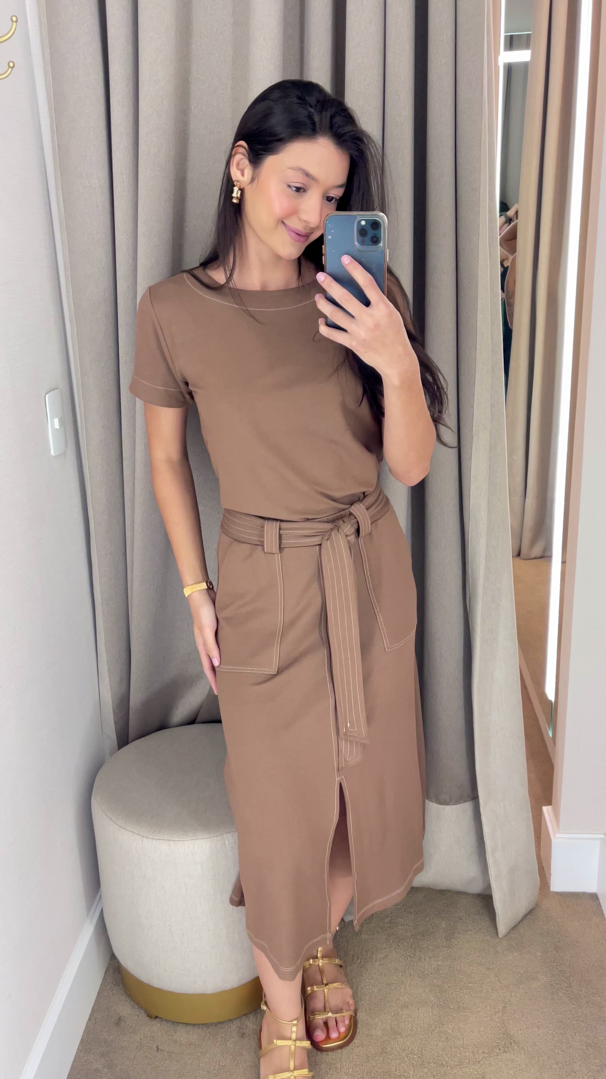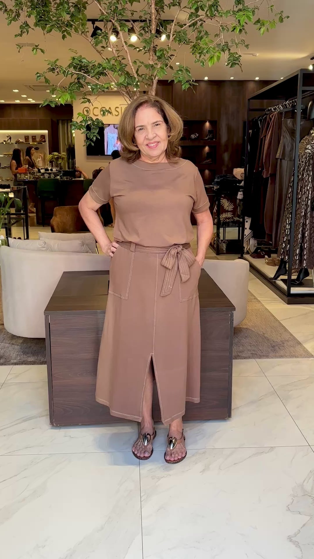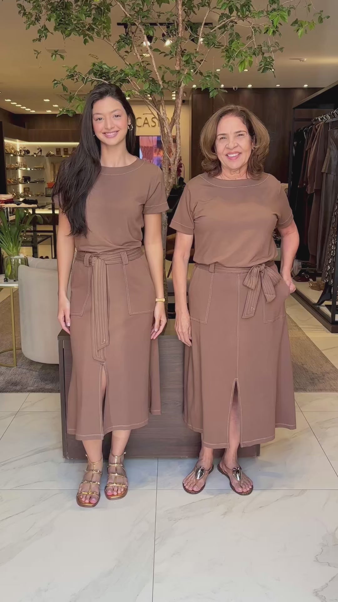 Conjunto em malha comfy composto por blusa de mangas curtas e saia midi com fenda frontal. A blusa tem modelagem reta e leve caimento no corpo, garantindo conforto e elegância no dia a dia. A saia possui amarração na cintura com faixa do mesmo tecido e bolsos utilitários, unindo praticidade e estilo. Um look versátil para diversas ocasiões!