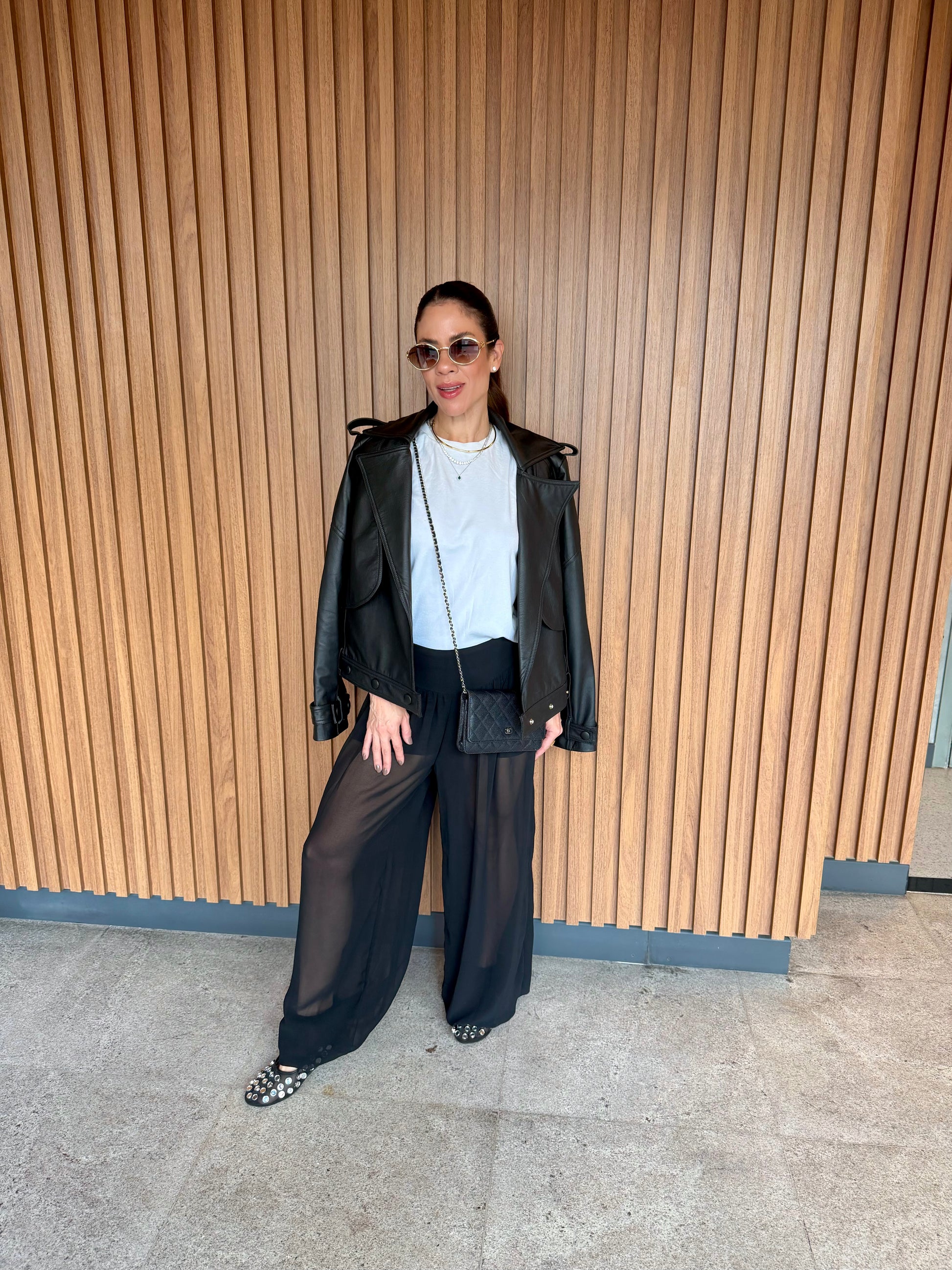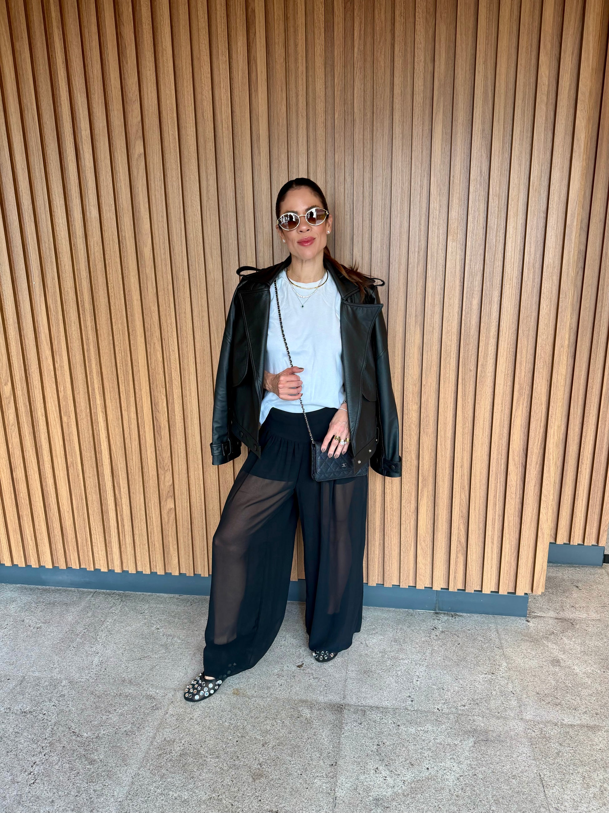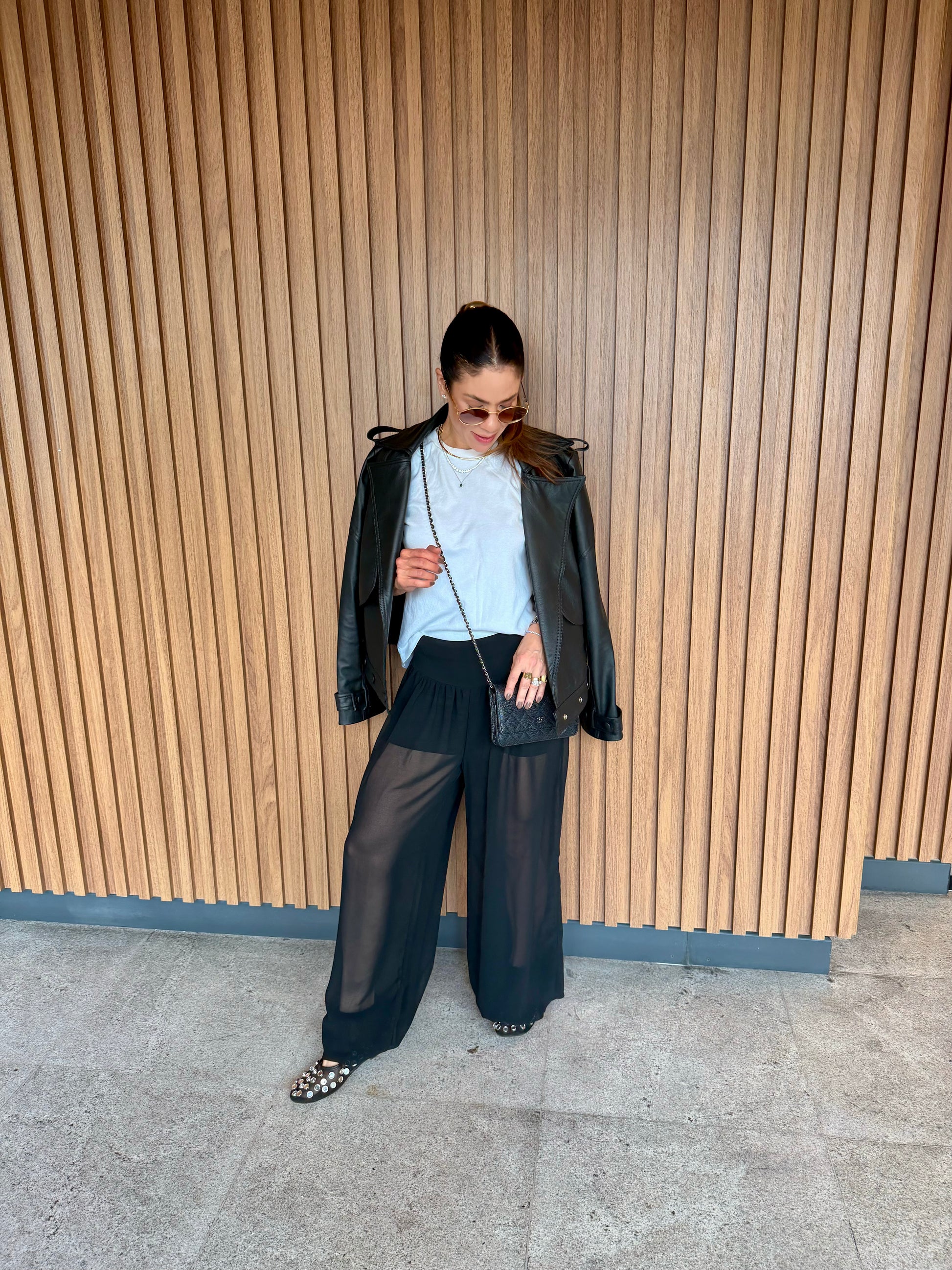 Calça Aladim preta em tecido leve e transparente, ideal para composições modernas e cheias de personalidade. O modelo fluido garante movimento e conforto, enquanto a transparência traz um toque fashion e ousado na medida certa.