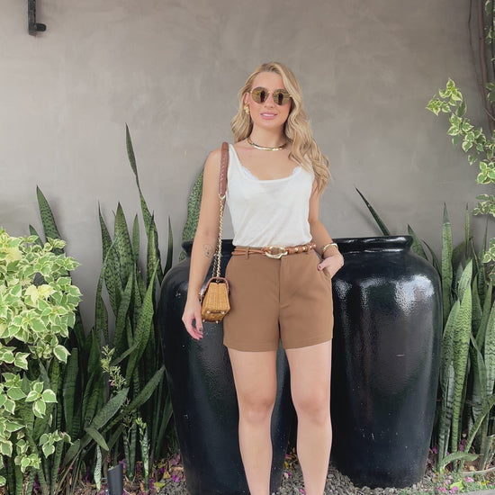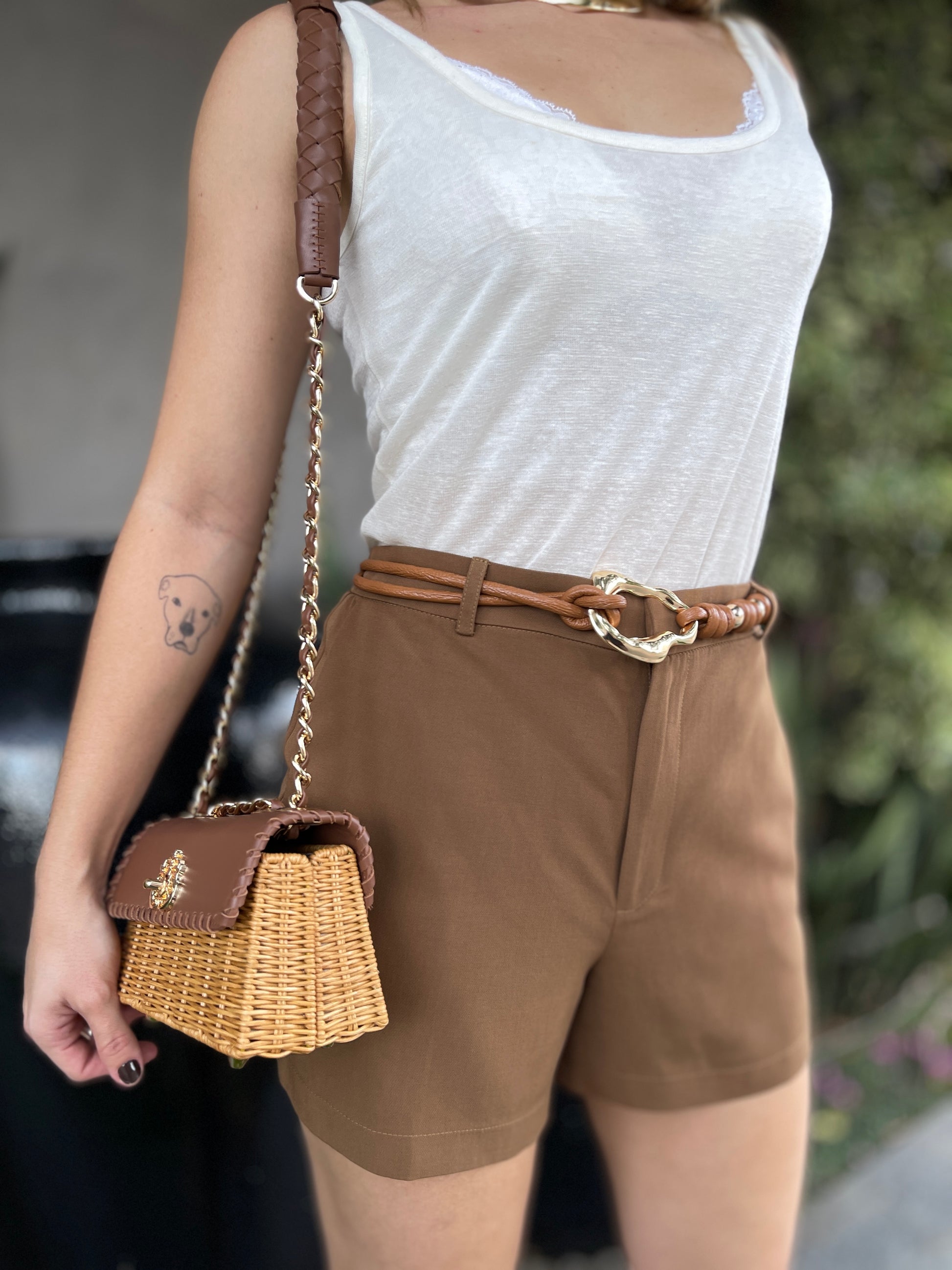 Shorts de alfaiataria em tom mocha mousse, com modelagem reta e cintura alta que valoriza a silhueta. Confeccionado em tecido encorpado com toque macio, possui fechamento frontal com zíper invisível e passantes para cinto.