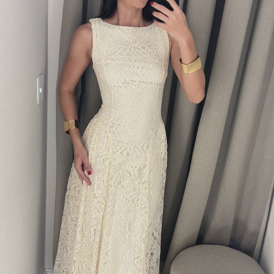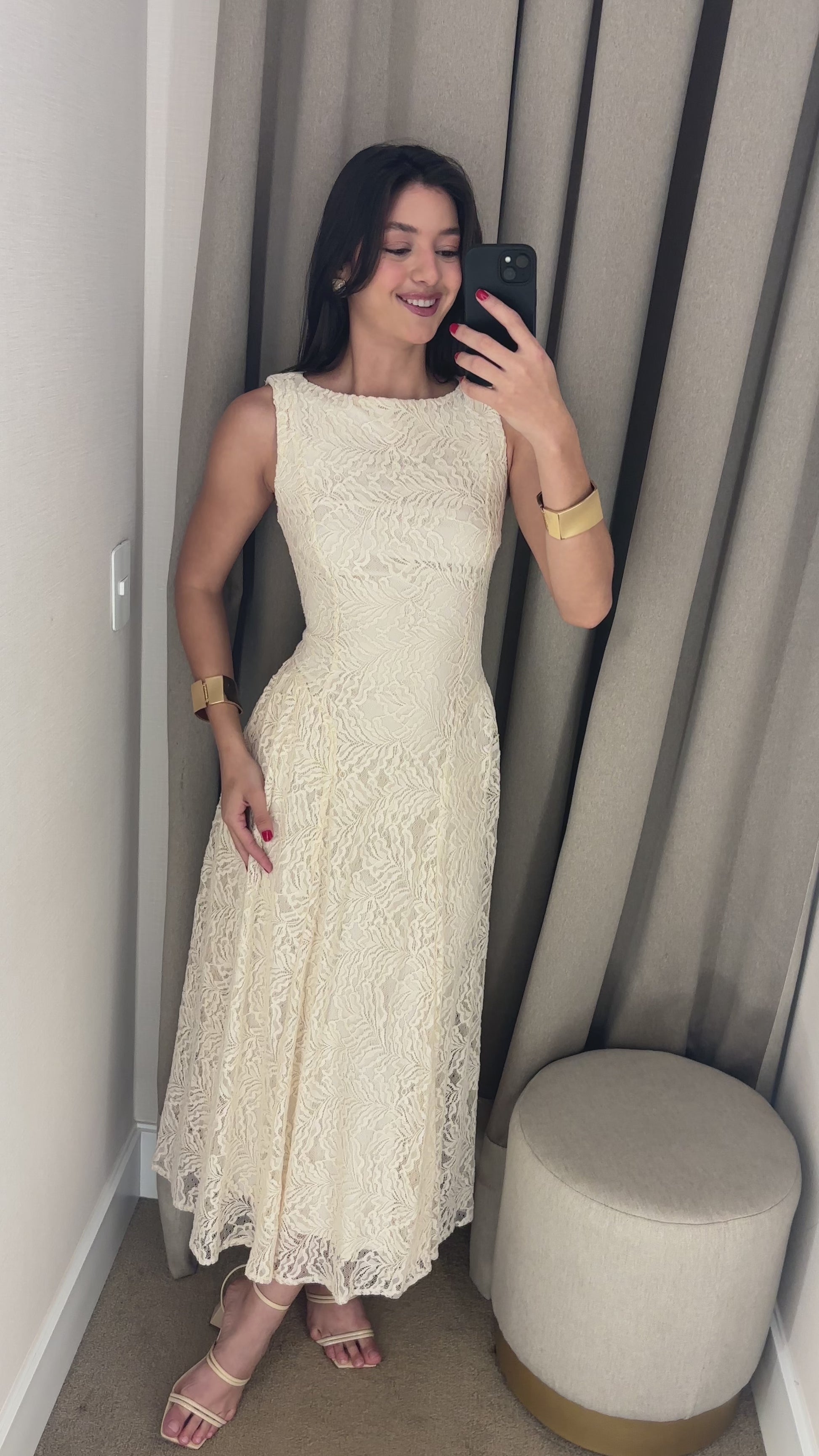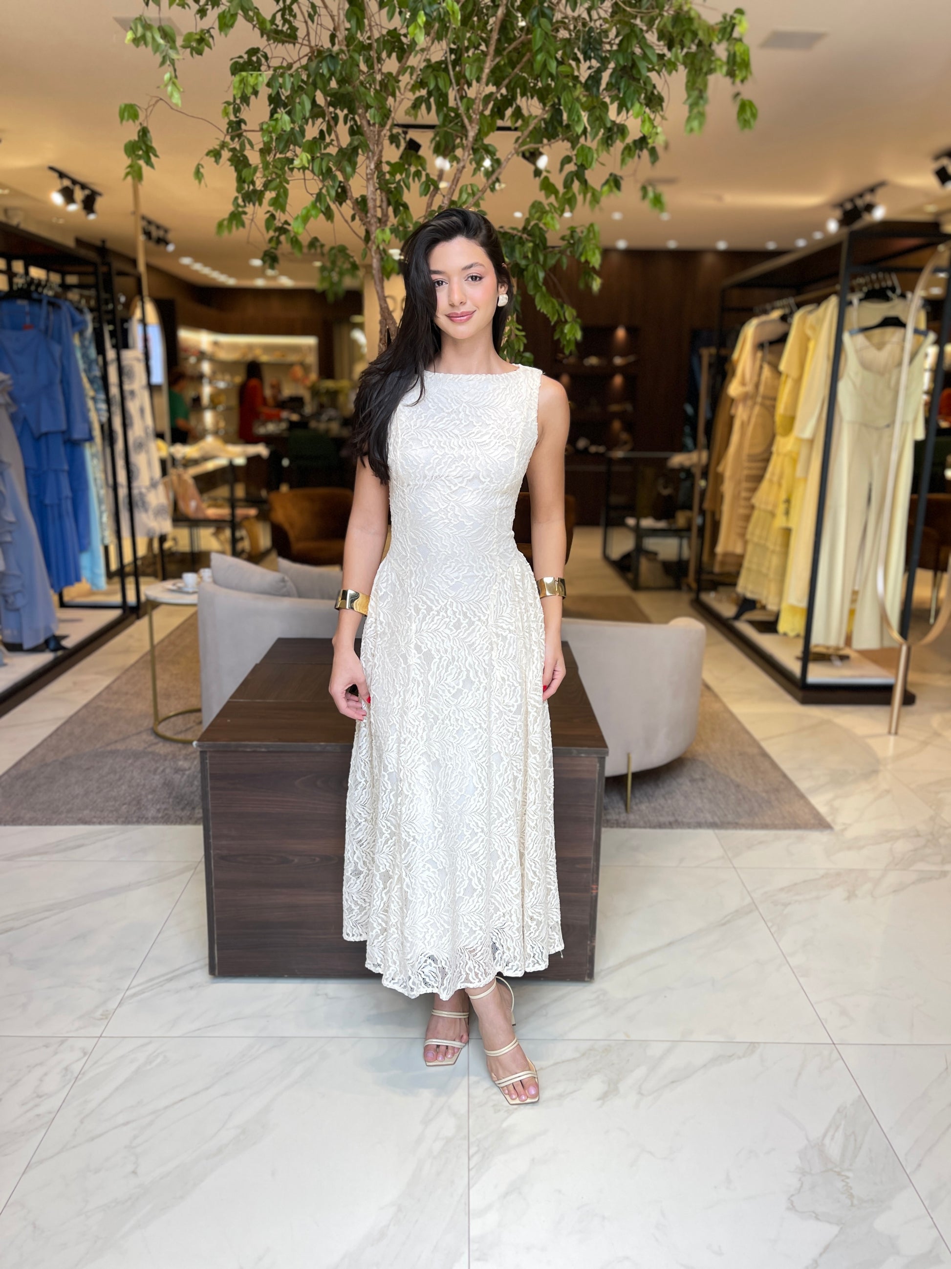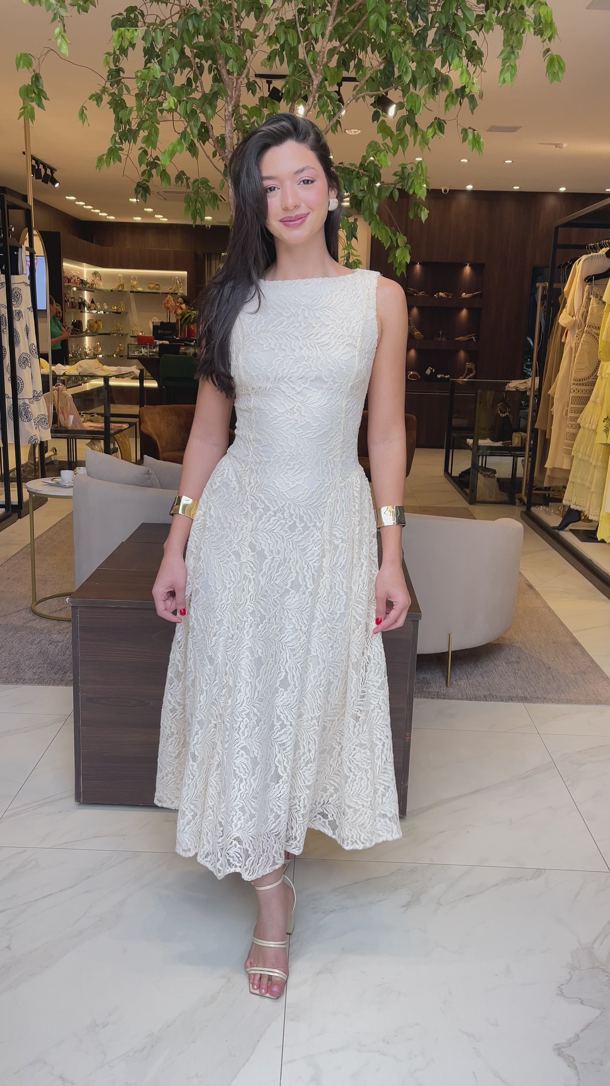 Vestido mídi rendado off-white com modelagem acinturada, decote redondo e caimento fluido, valoriza a silhueta com delicadeza. O tecido de renda confere um toque romântico e sofisticado.